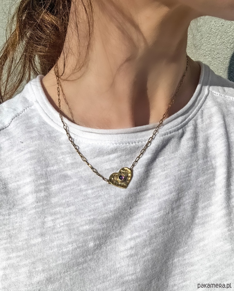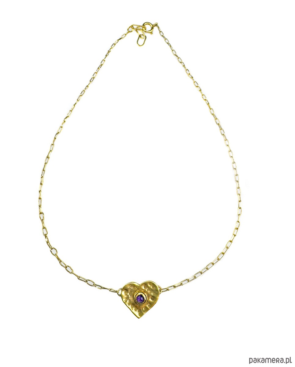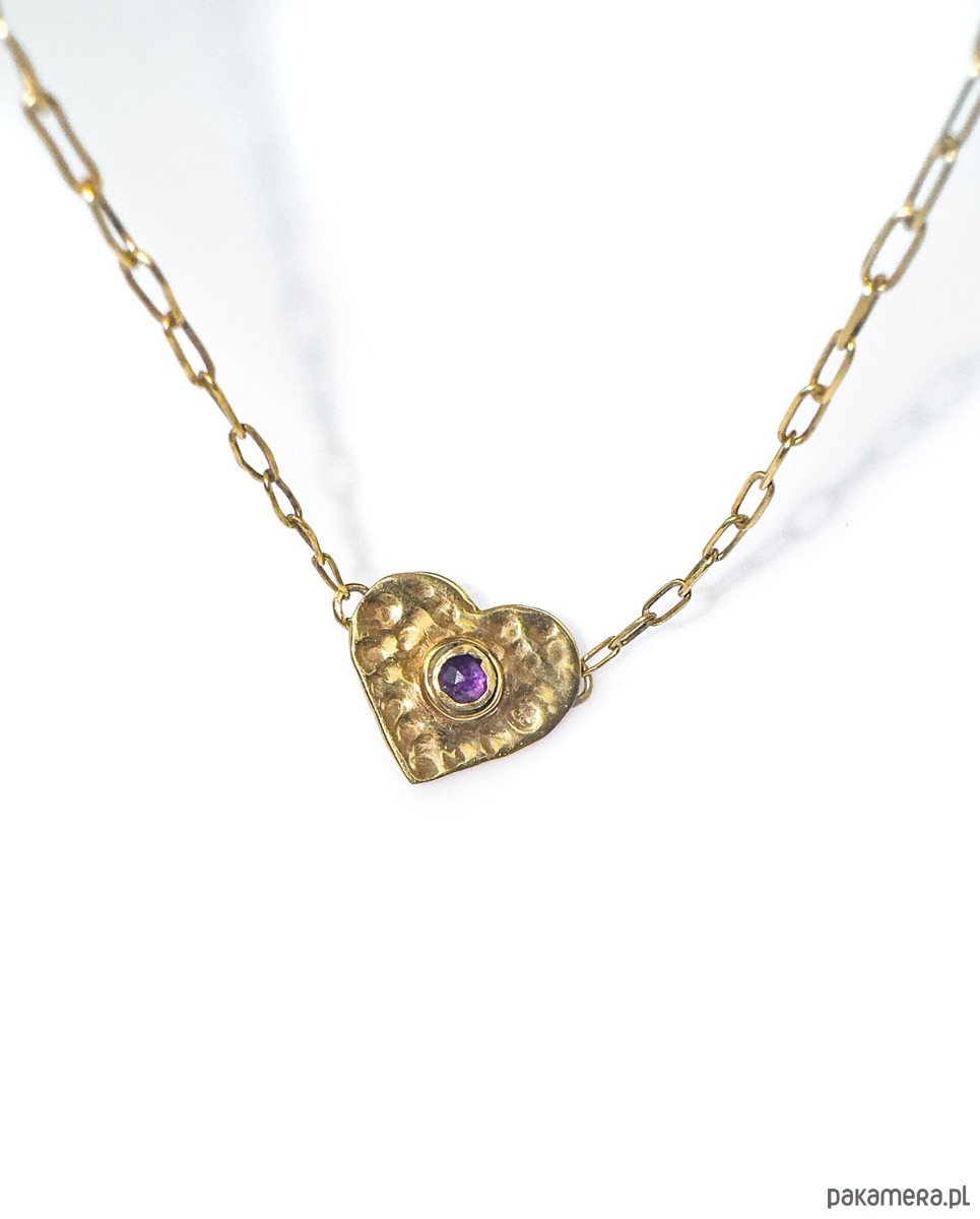 Naszyjnik z motywem serca i ametystem oprawionym w centralnej części zawieszki. Całość wykonana ręcznie ze srebra 925, złoconego 24 k złotem. Powierzchnia serduszka fakturowana.