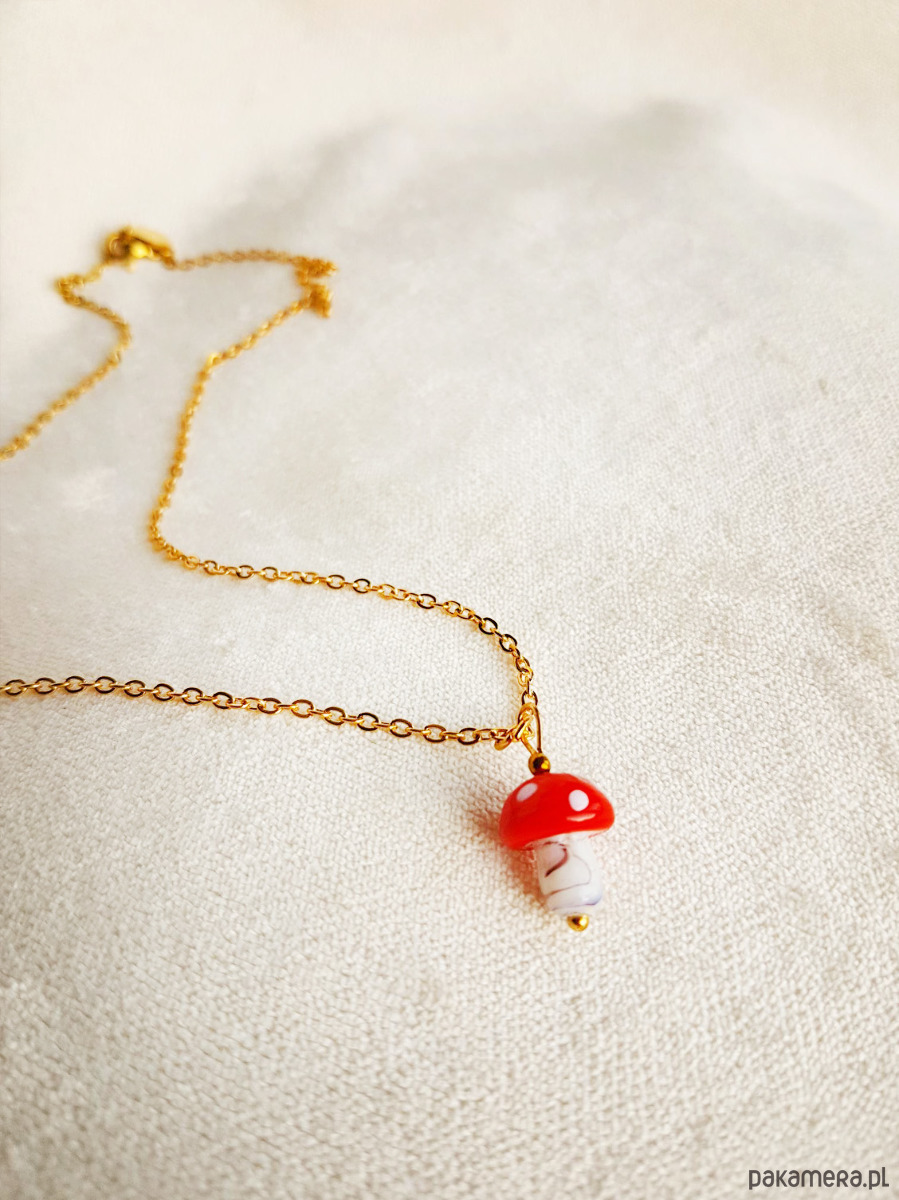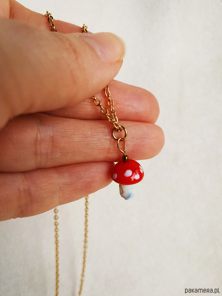 Uroczy naszyjnik Barboleta z grzybkiem muchomorkiem z ręcznie formowanego szkła.