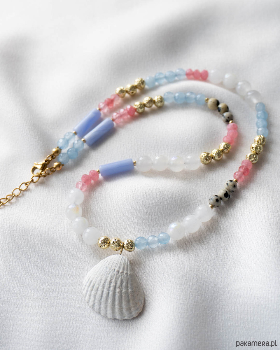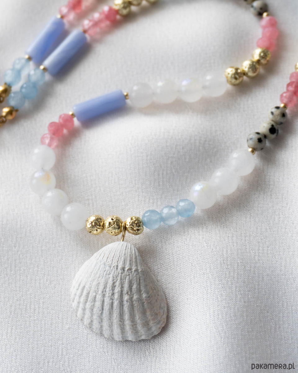 Naszyjnik z kamienia księżycowego, agatu, jaspisu dalmatyńskiego i lawy wulkanicznej z zawieszką muszelką. Naszyjnik wykonany z kamienia naturalnego, zapięcia i przekładki ze stali chirurgicznej w kolorze złotym.