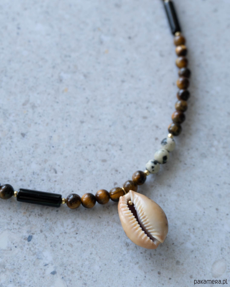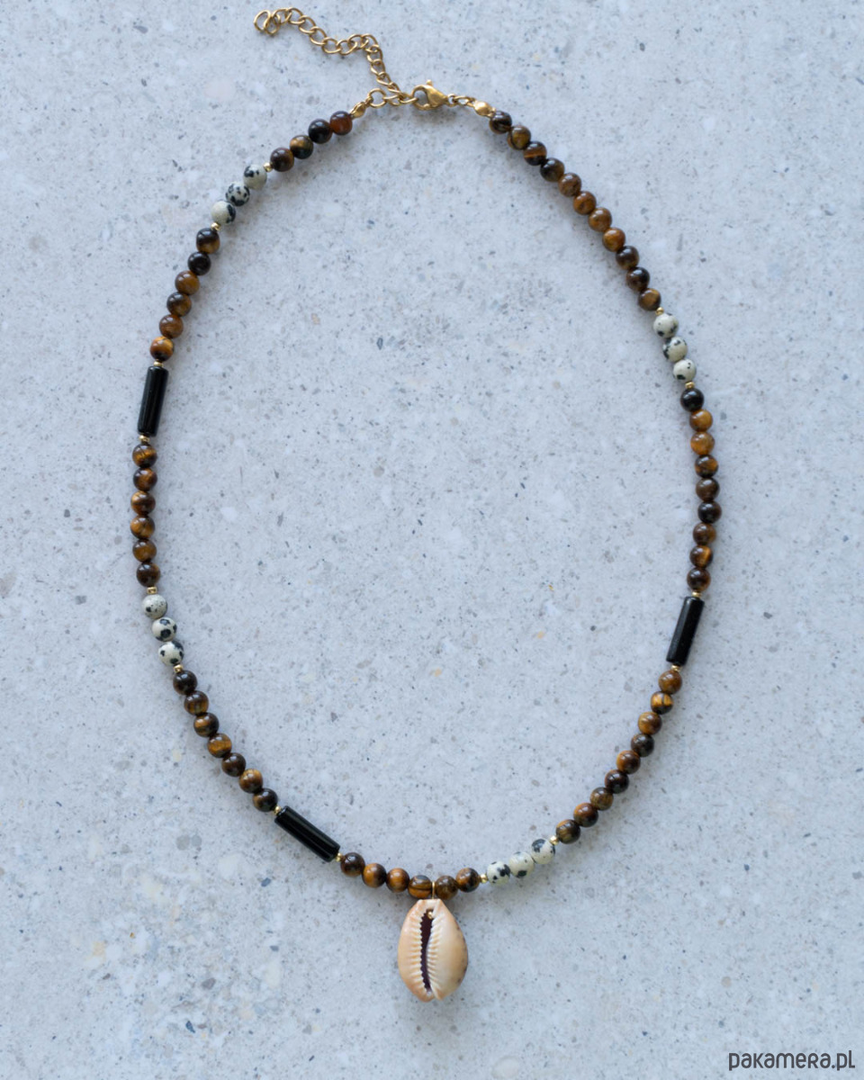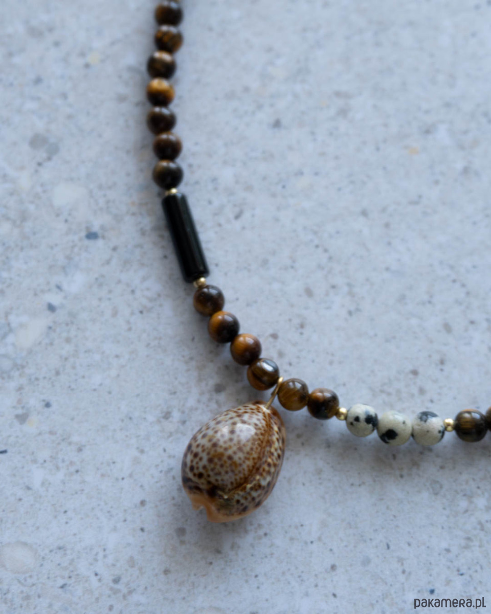 Naszyjnik z tygrysiego oka, jaspisu dalmatyńskiego i onyksu z zawieszką muszelką. Naszyjnik wykonany z kamienia naturalnego, zapięcia i przekładki ze stali chirurgicznej w kolorze złotym.