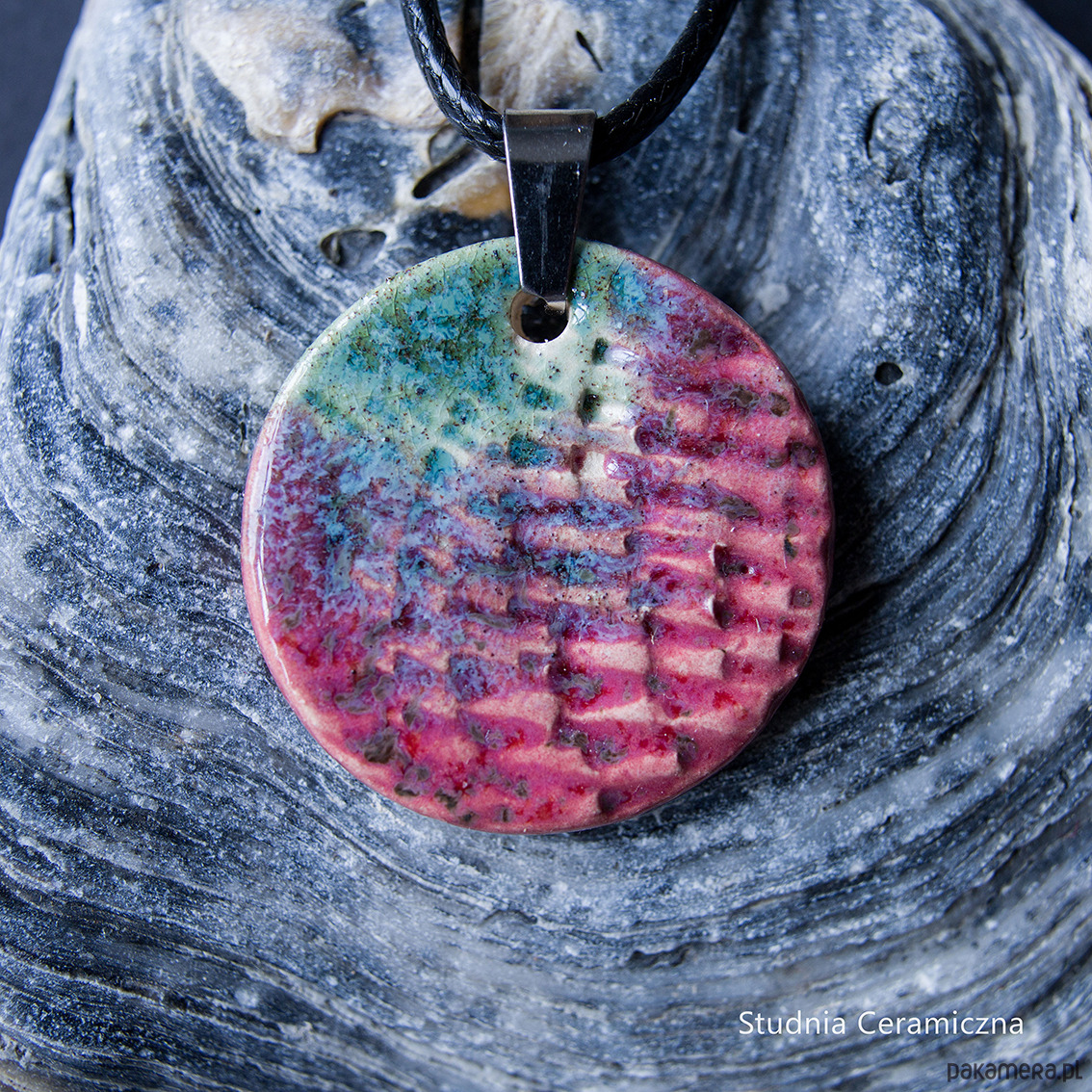 Naszyjnik ceramiczny z muszlą pokryty autorską mieszanką szkliw, które pięknie się przenikają