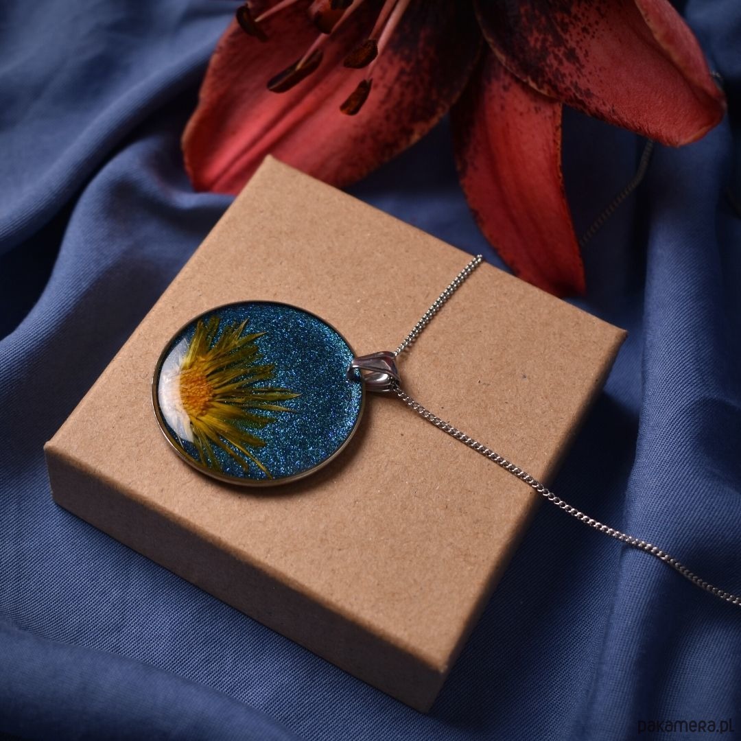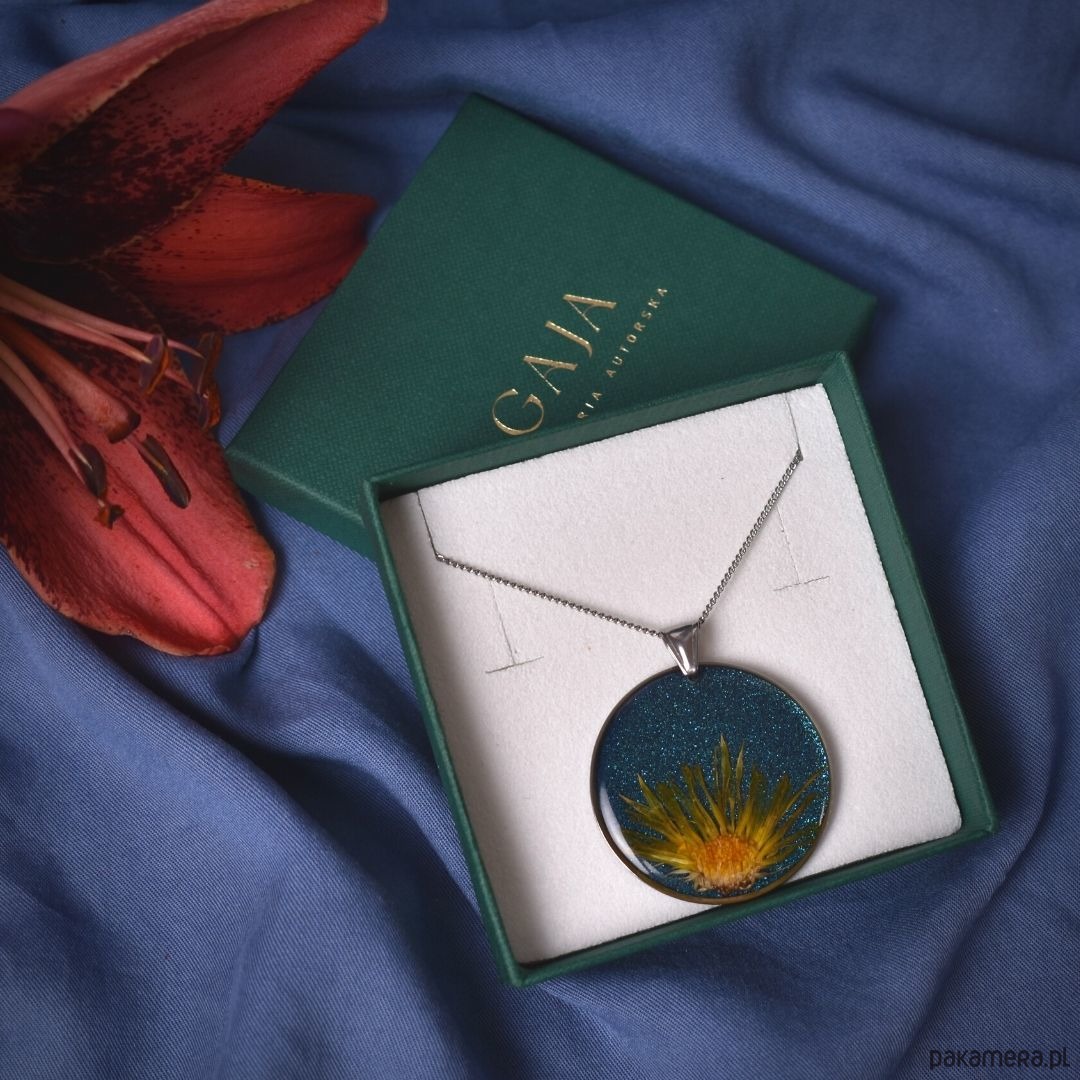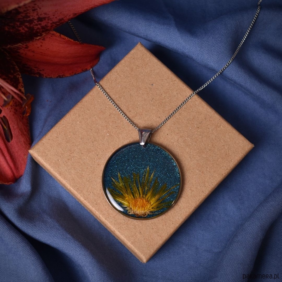 Przedstawiam bardzo kobiecy naszyjnik z kwiatem nagietka zamkniętym w krystalicznej żywicy. Jest to unikatowy naszyjnik wykonany ręcznie z największą starannością w pracowni Gai. Taka biżuteria może być idealnym prezentem dla Siebie lub ważnej dla Ciebie Kobiety. Naszyjnik zostanie zapakowany w ekologiczne pudełeczko na biżuterię, posiadające certyfikat FSC.