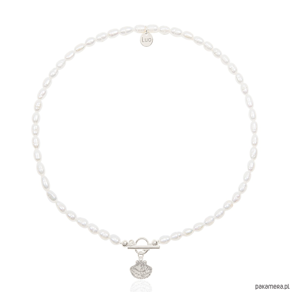 Naszyjnik z naturalnych pereł ze srebrną grawerowaną muszelką. Całość wykonana z naturalnych pereł słodkowodnych w kolorze białym. Zawieszka, logo i zapięcie toggle wykonane ze srebra 925.