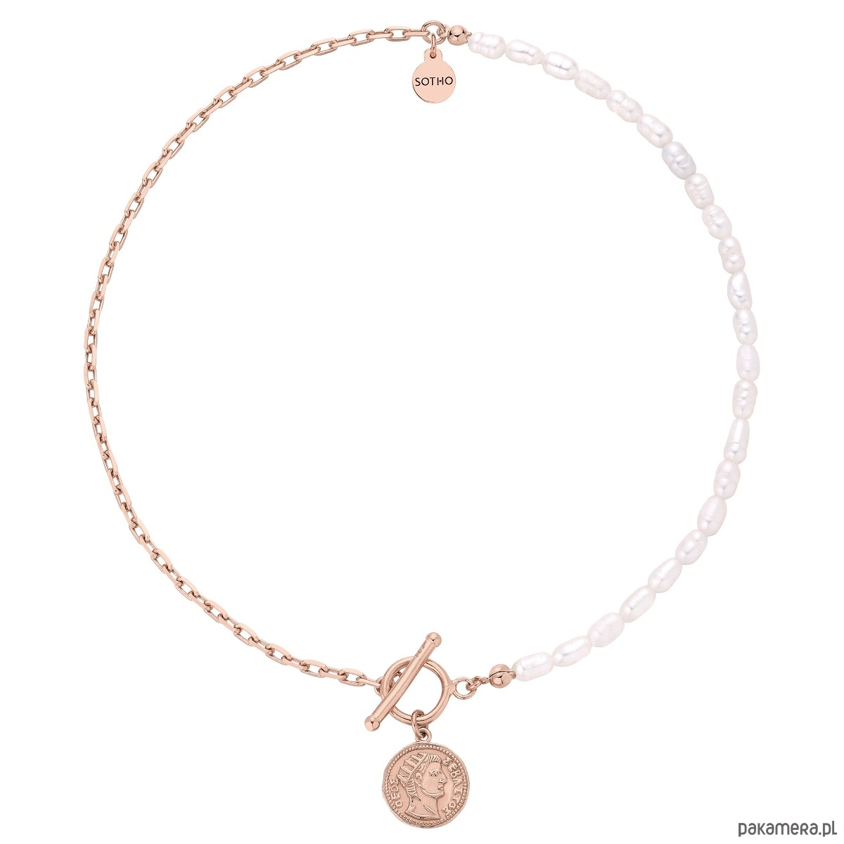 Złoty naszyjnik z naturalnych pereł zdobiony monetą, łańcuchem i zawieszką z logo marki. Całość wykonana ze srebra 925 pokrytego 18 karatowym różowym złotem.