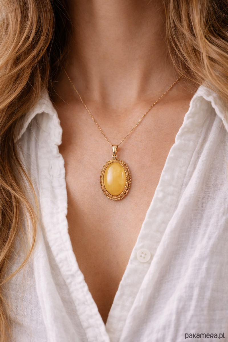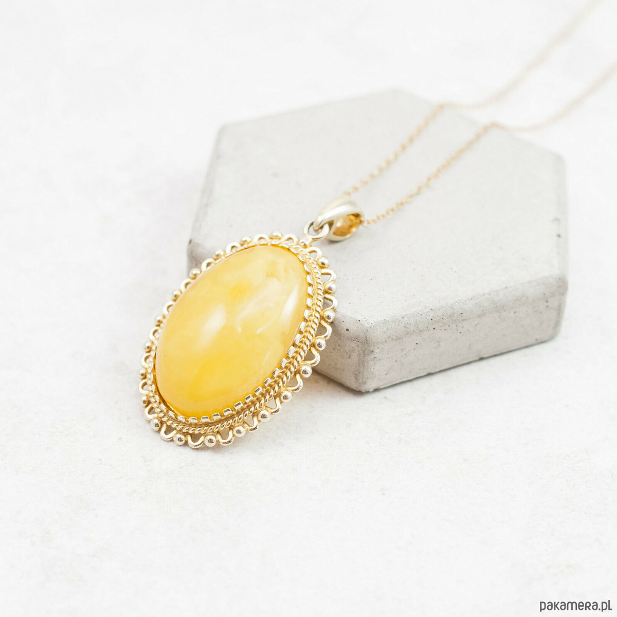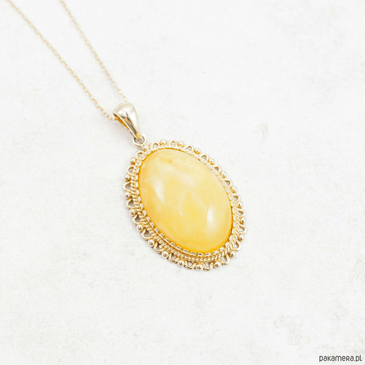 Naturalny bursztyn bałtycki o kształcie owalnym (30 x 20 mm) w intensywnym żółtym odcieniu został osadzony w misternie zdobionej oprawie ze srebra próby 925 pokrytego warstwą żółtego złota. Oprawa w stylu antycznym z delikatnym, koronkowym wykończeniem podkreśla wyjątkowy charakter kamienia i nadaje kompletowi artystycznego, boho-eleganckiego wyrazu.