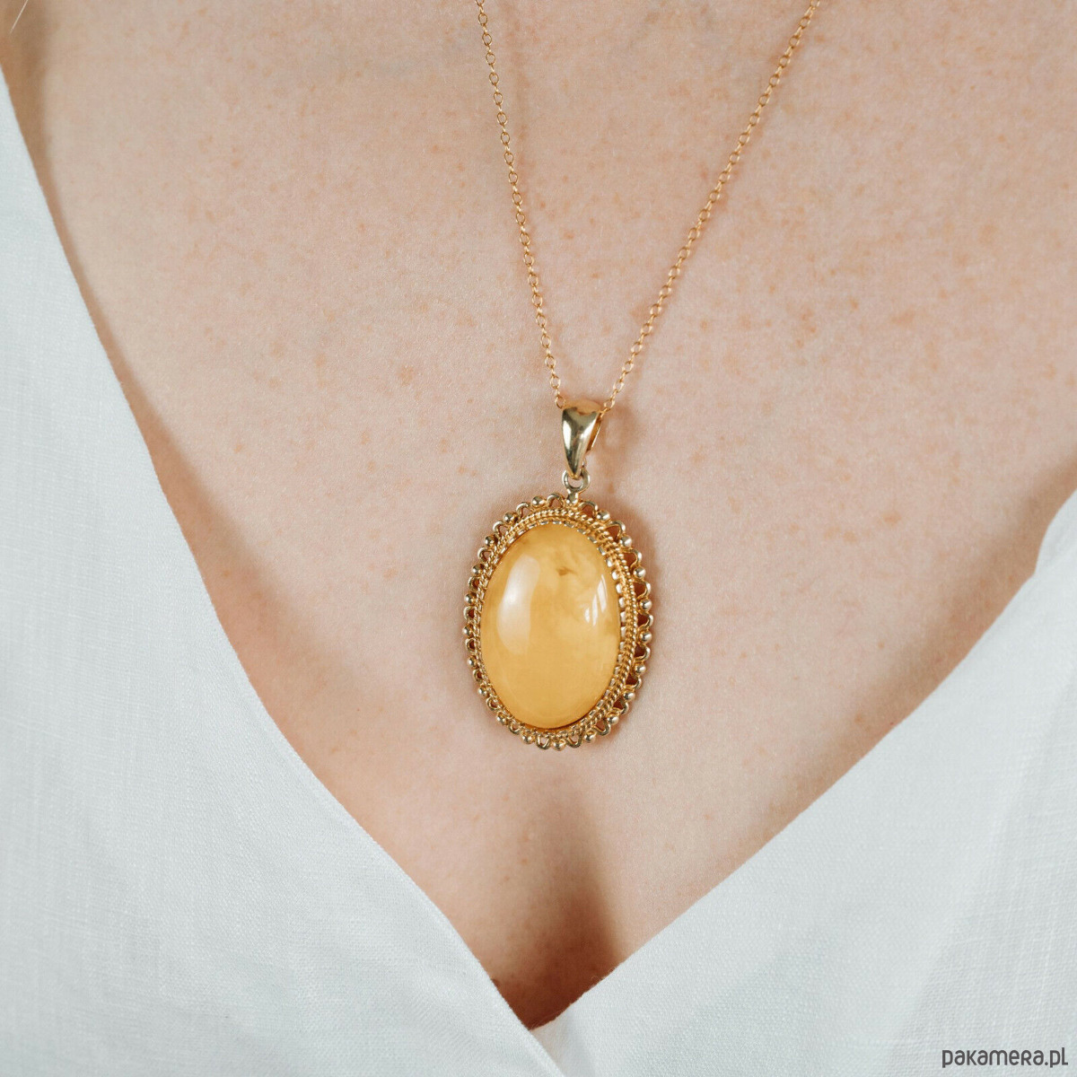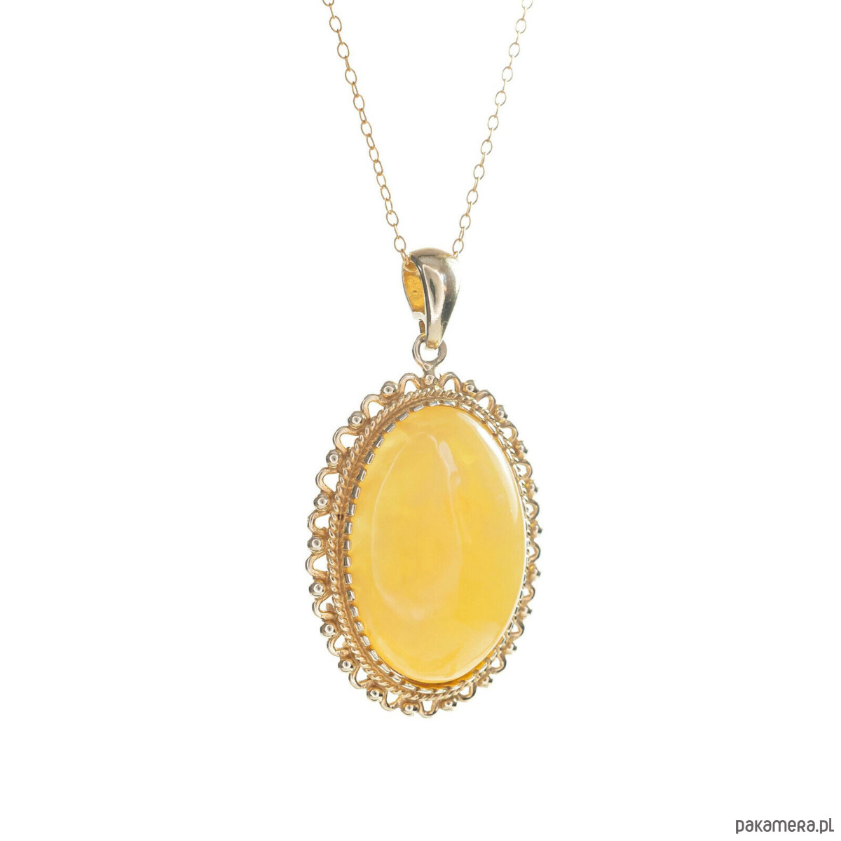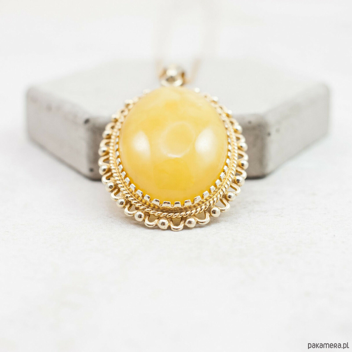 Naturalny bursztyn bałtycki o kształcie owalnym (30 x 20 mm) w intensywnym żółtym odcieniu został osadzony w misternie zdobionej oprawie ze srebra próby 925 pokrytego warstwą żółtego złota. Oprawa w stylu antycznym z delikatnym, koronkowym wykończeniem podkreśla wyjątkowy charakter kamienia i nadaje kompletowi artystycznego, boho-eleganckiego wyrazu.