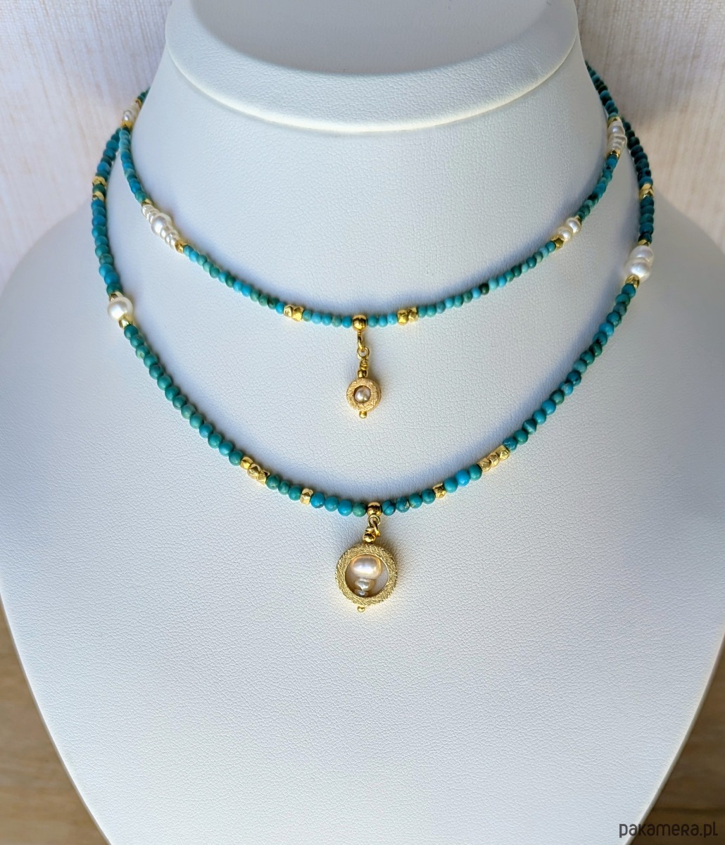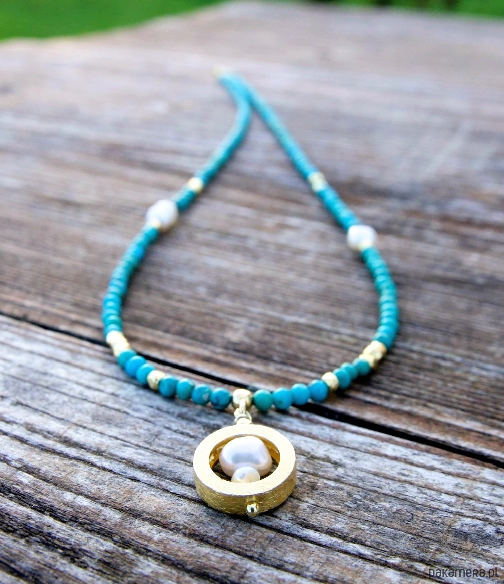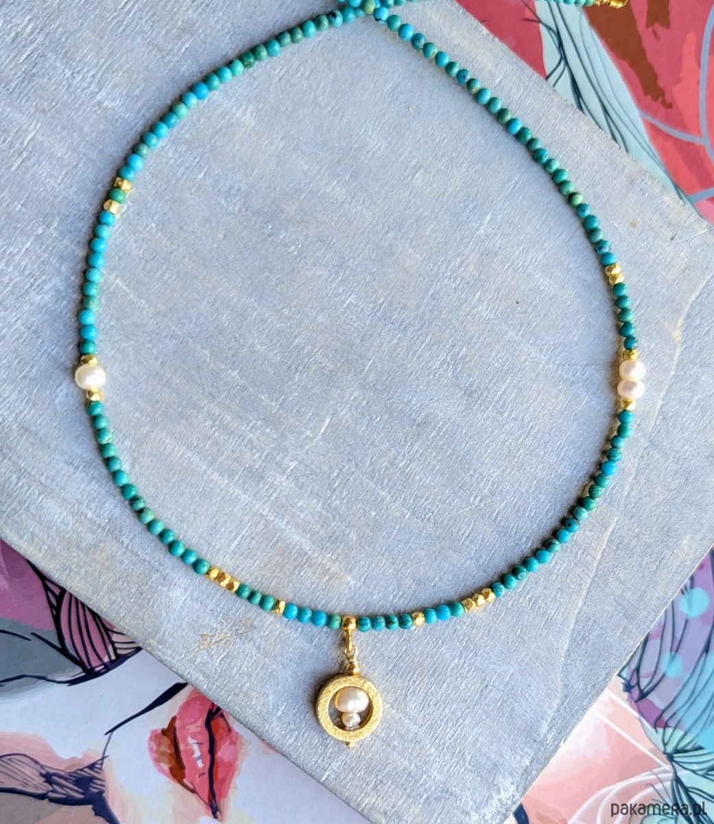 Naturalny turkus w pięknych odcieniach błękitu. Jasny, gładki, przekładany drobnymi perełkami i dodatkami z pozłacanego srebra. Kolory pięknie kontrastują z odcieniem skóry, a szczególnie korzystnie wyglądają na ciele muśniętym słońcem. Zawieszka składa się z kilku perełek w pozłacanej obręczy. Akcenty na naszyjniku zostały rozłożone lekko asymetrycznie.