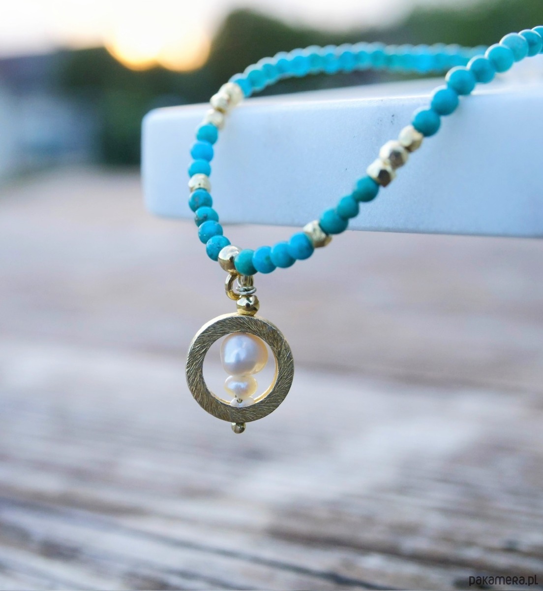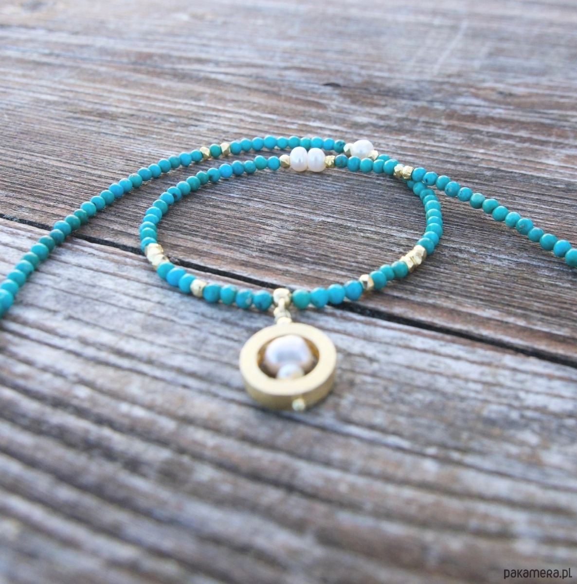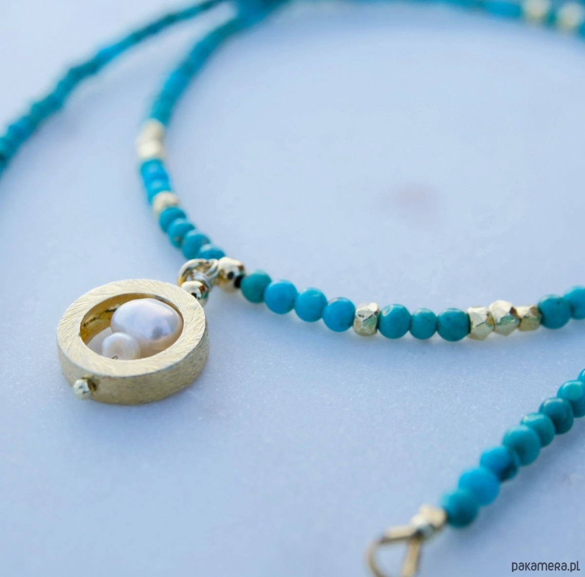 Naturalny turkus w pięknych odcieniach błękitu. Jasny, gładki, przekładany drobnymi perełkami i dodatkami z pozłacanego srebra. Kolory pięknie kontrastują z odcieniem skóry, a szczególnie korzystnie wyglądają na ciele muśniętym słońcem. Zawieszka składa się z kilku perełek w pozłacanej obręczy. Akcenty na naszyjniku zostały rozłożone lekko asymetrycznie.