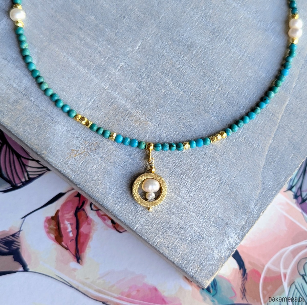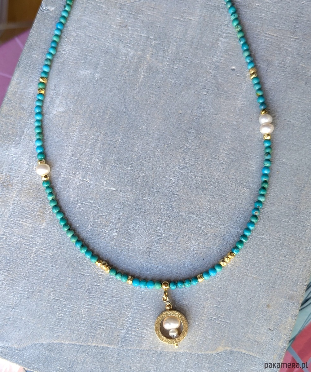 Naszyjnik z naturalnym turkusem i perłami