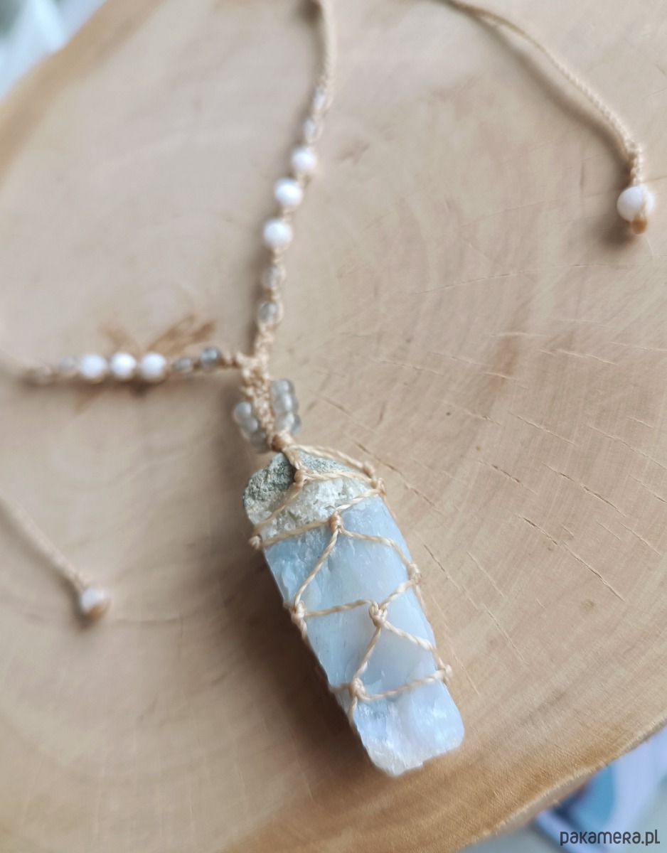 Naszyjnik z kalcytem niebieskim (wielkość kamienia- 1,8/ 4,7 cm) Dodatkowe kamienie to labradoryt (4 mm) i masa perłowa (5mm).