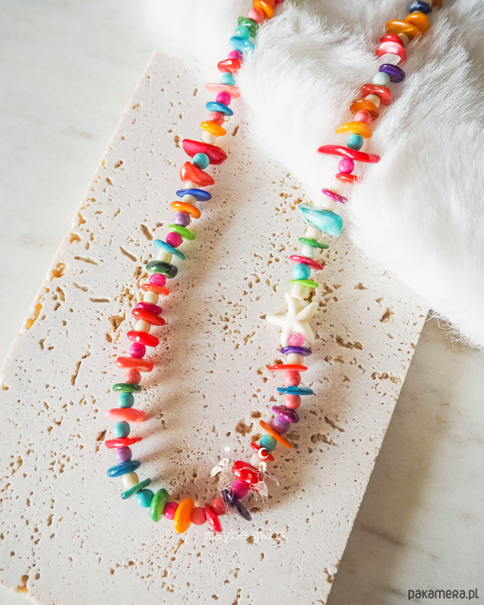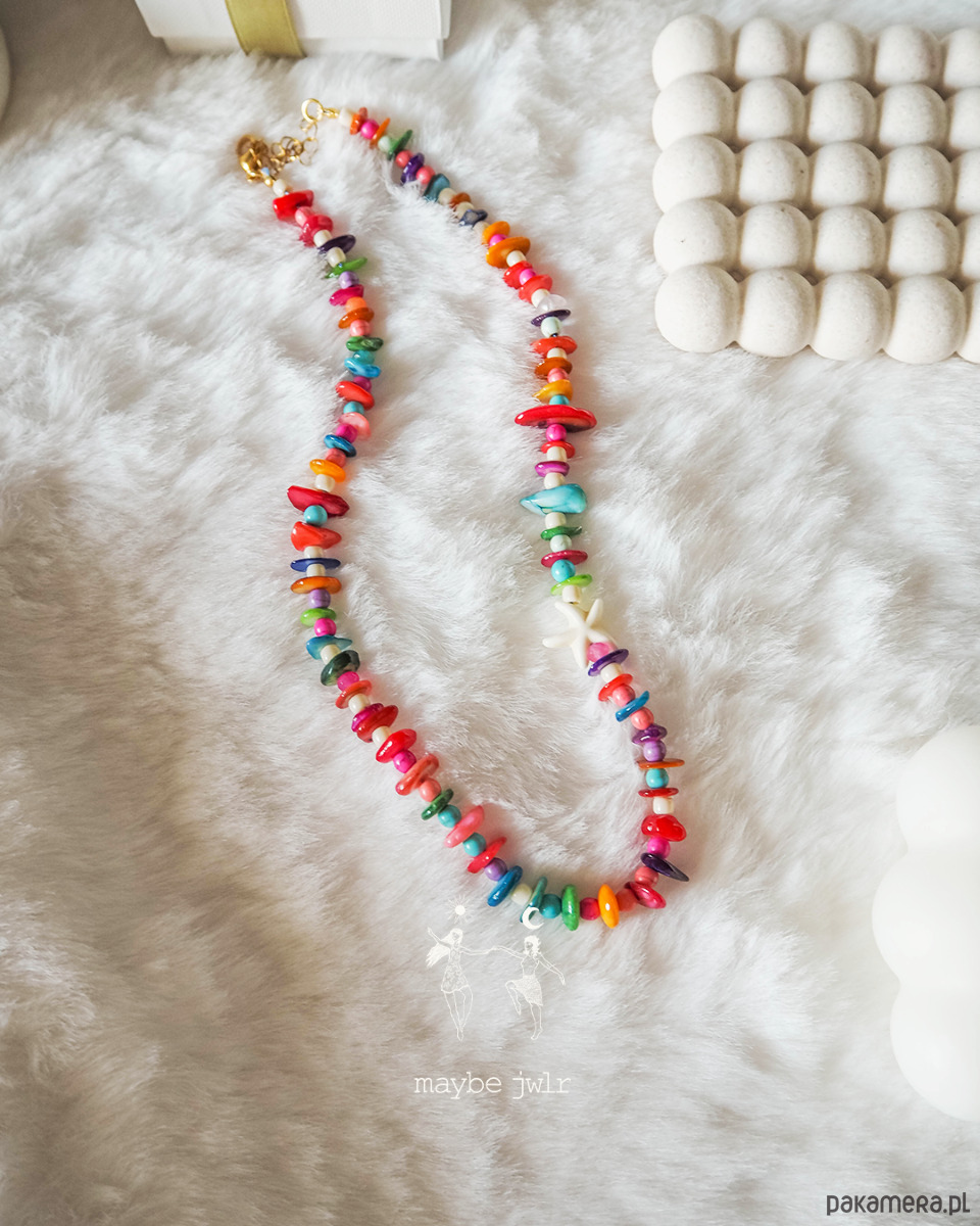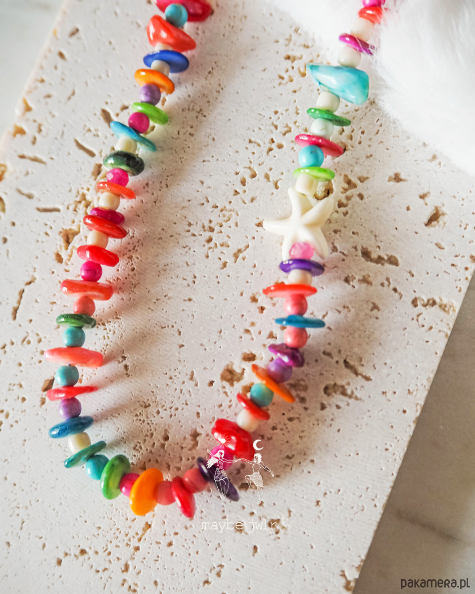 Lekki jak letni wiatr i pełen barw, które przywołują wspomnienia najpiękniejszych wakacyjnych chwil. Ręcznie wykonany z nieregularnych kamieni i naturalnej muszli, tworzy radosną, swobodną kompozycję — jakby każda z jego części miała w sobie odrobinę słońca i dobrej energii.