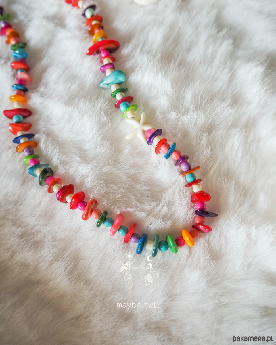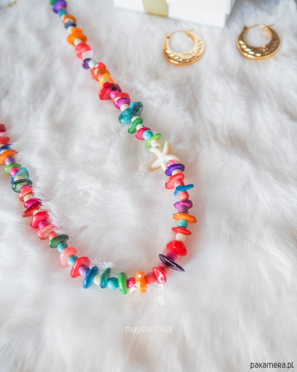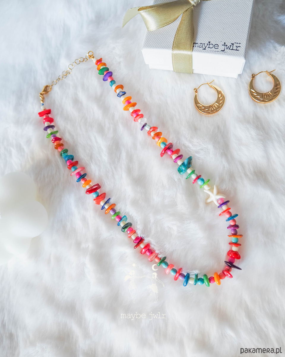 Lekki jak letni wiatr i pełen barw, które przywołują wspomnienia najpiękniejszych wakacyjnych chwil. Ręcznie wykonany z nieregularnych kamieni i naturalnej muszli, tworzy radosną, swobodną kompozycję — jakby każda z jego części miała w sobie odrobinę słońca i dobrej energii.