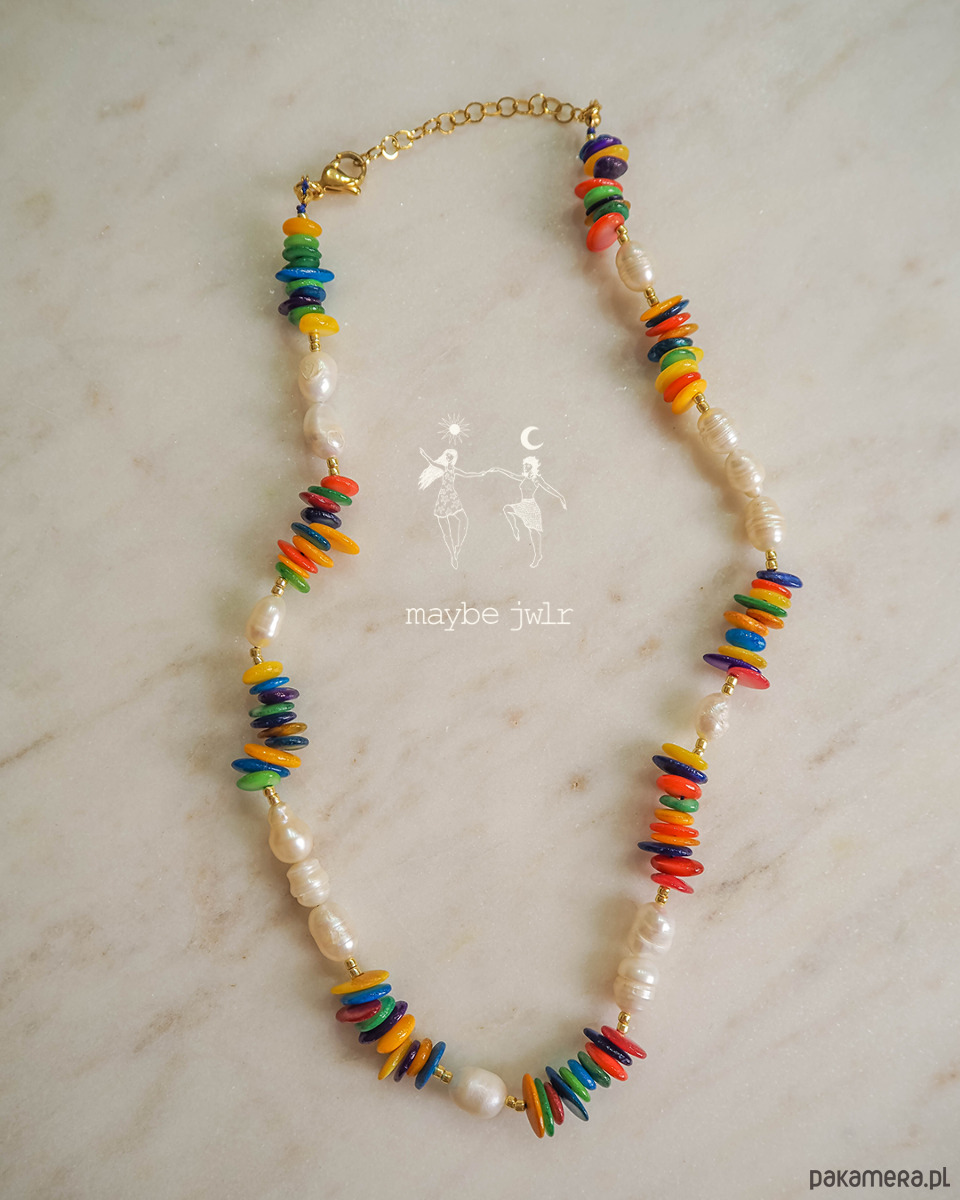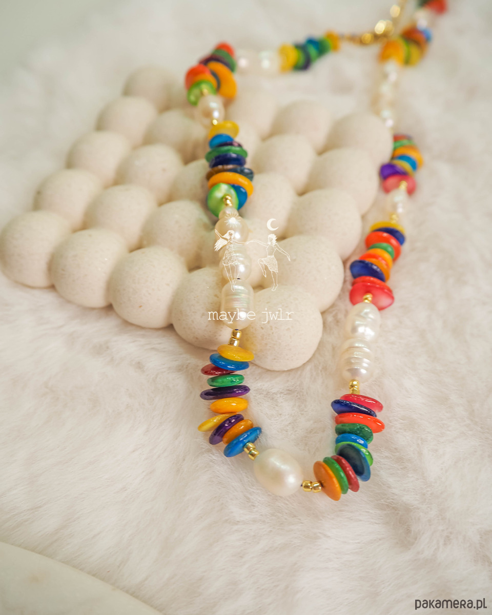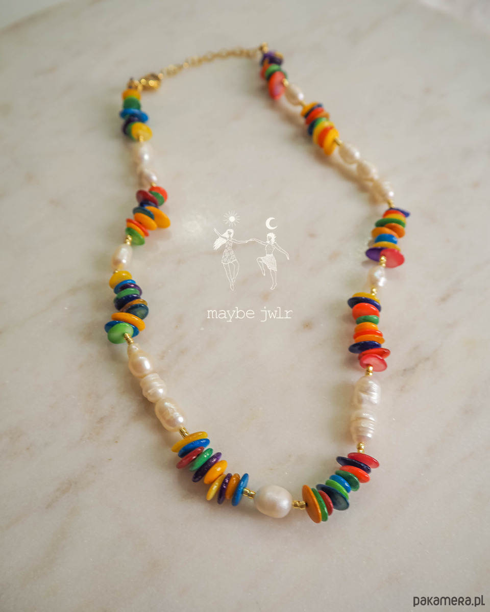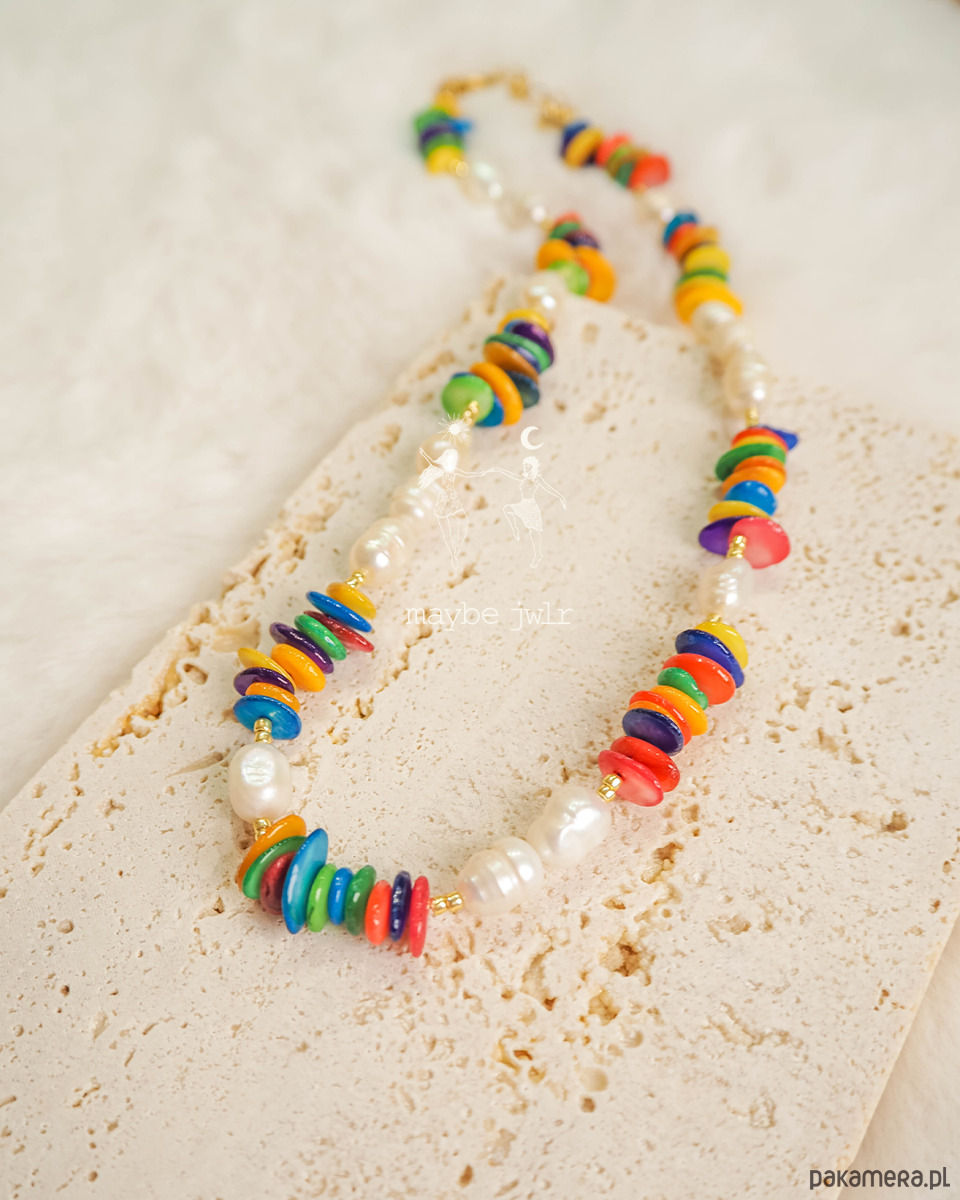Naszyjnik z nieregularnych kolorowych muszli, przeplatany złotymi koralikami Toho oraz perłami naturalnymi.