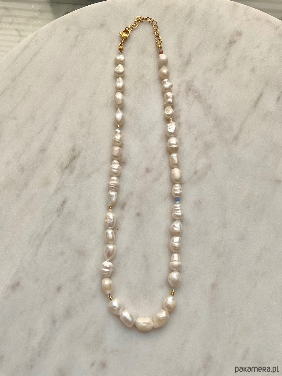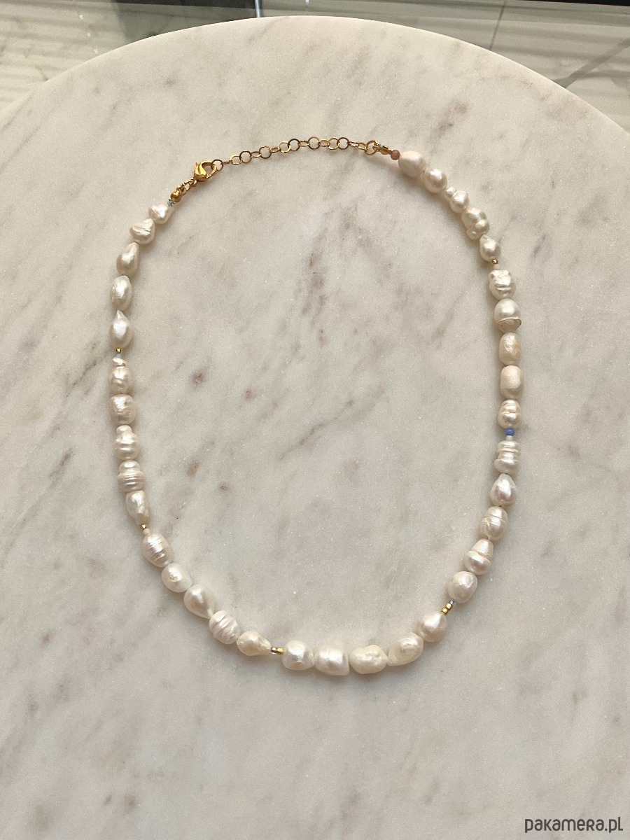 Naszyjnik z nieregularnych pereł o wielkości 5-7mm. Zrobiony ręczne, nawleczony na jedwabną nić.