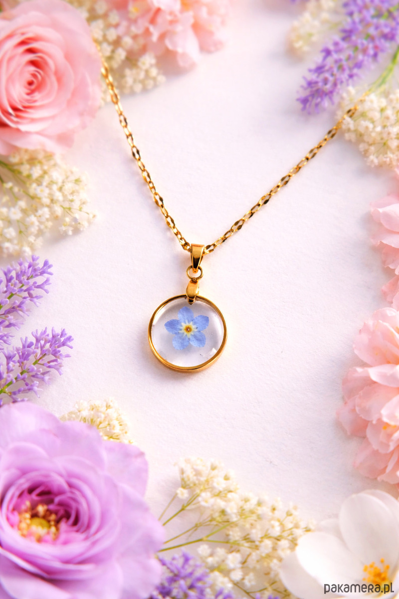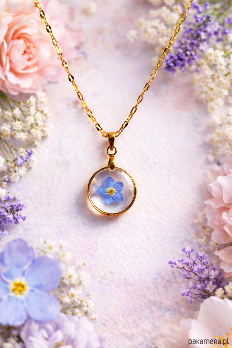 Subtelny, ręcznie wykonany naszyjnik, w którym prawdziwa niezapominajka została na stałe zatopiona w krystalicznie przejrzystej żywicy. Delikatny, jasnoniebieski kwiat pięknie kontrastuje z minimalistyczną, złoconą oprawą, tworząc elegancką i bardzo kobiecą kompozycję.