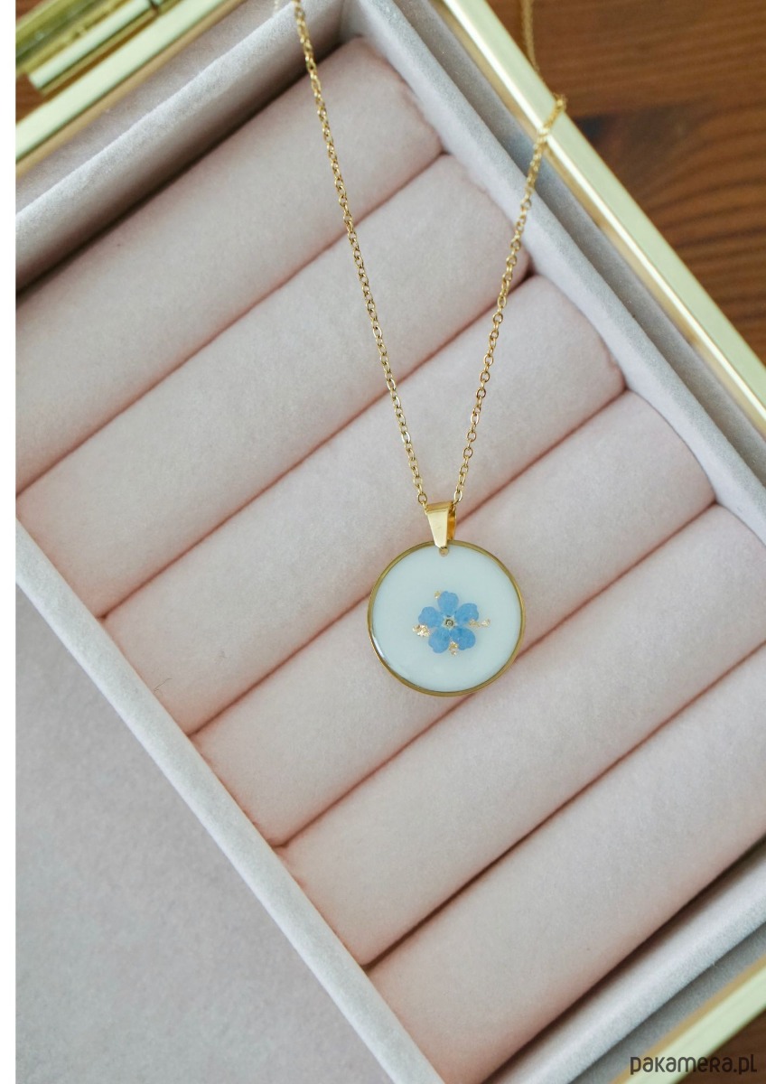 Naszyjnik wykonany ręcznie z suszonych kwiatów oraz żywicy epoksydowej. Wielkość zawieszki 20 mm. Długość łańcuszka 50 cm. Wykończenie oraz łańcuszek wykonane ze stali chirurgicznej w kolorze złotym. Naszyjnik pakowany jest w eleganckie pudełeczko prezentowe. Żywica epoksydowa nazywana „szkłem jubilerskim” jest coraz częściej stosowanym materiałem w tworzeniu biżuterii. Po zastygnięciu cechuje się wysokim połyskiem oraz przepięknie wydobywa kształt wraz z kolorem zatopionych elementów.