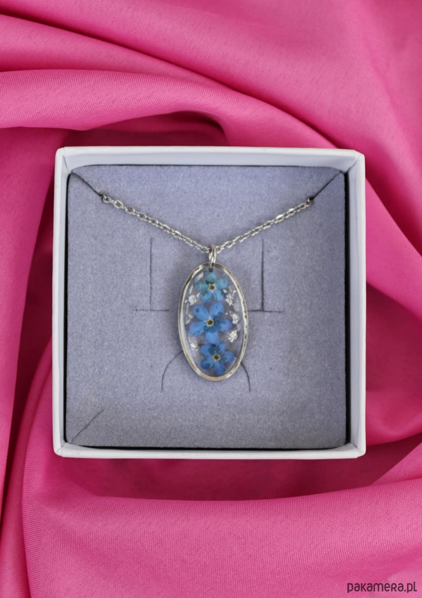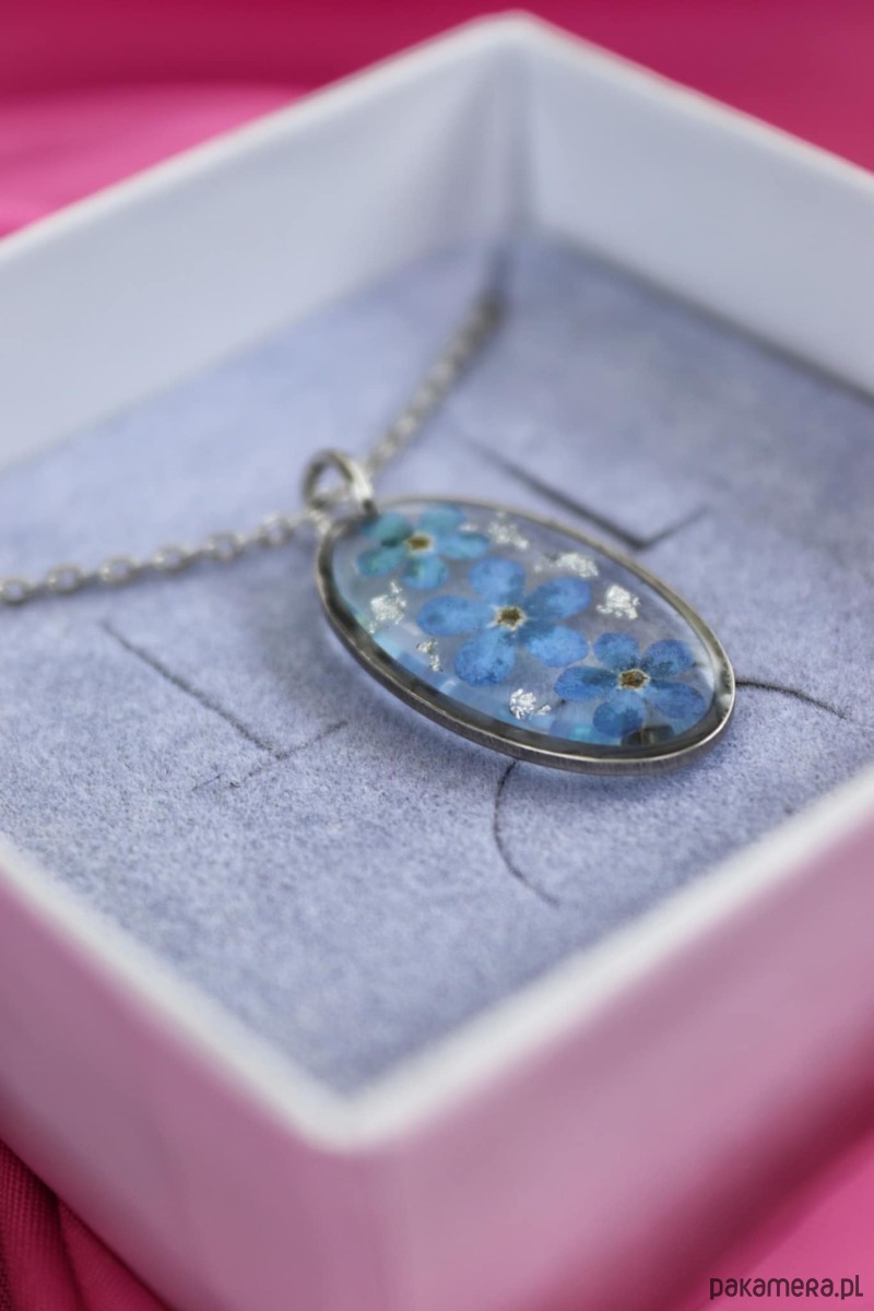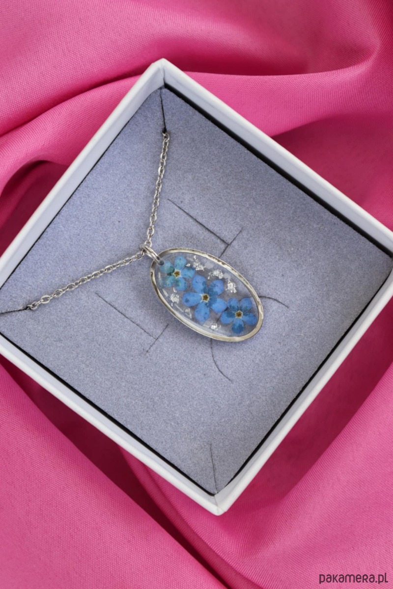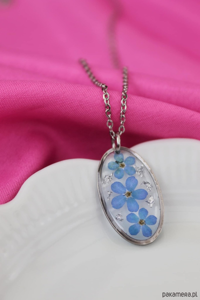 Naszyjnik z kwiatami suszonej niezapominajki to unikatowa, ręcznie wykonana biżuteria z serii Wdzięczność.