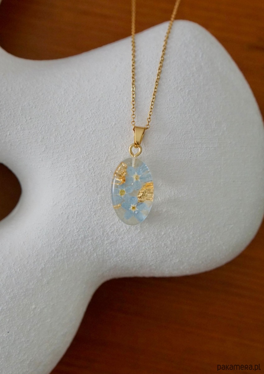 Naszyjnik wykonany ręcznie z suszonych kwiatów niezapominajki oraz żywicy epoksydowej. Wielkość zawieszki 22 mm, grubość 7 mm. Długość łańcuszka 50 cm. Wykończenie oraz naszyjnik wykonane ze stali chirurgicznej. Naszyjnik pakowany jest w eleganckie pudełeczko prezentowe. Żywica epoksydowa nazywana „szkłem jubilerskim” jest coraz częściej stosowanym materiałem w tworzeniu biżuterii. Po zastygnięciu cechuje się wysokim połyskiem oraz przepięknie wydobywa kształt wraz z kolorem zatopionych elementów.