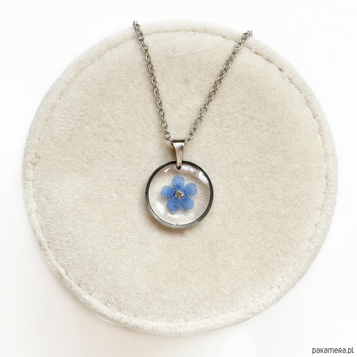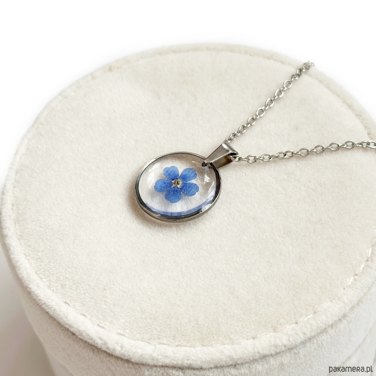 W naszyjniku zostały utrwalone kwiaty niezapominajki.