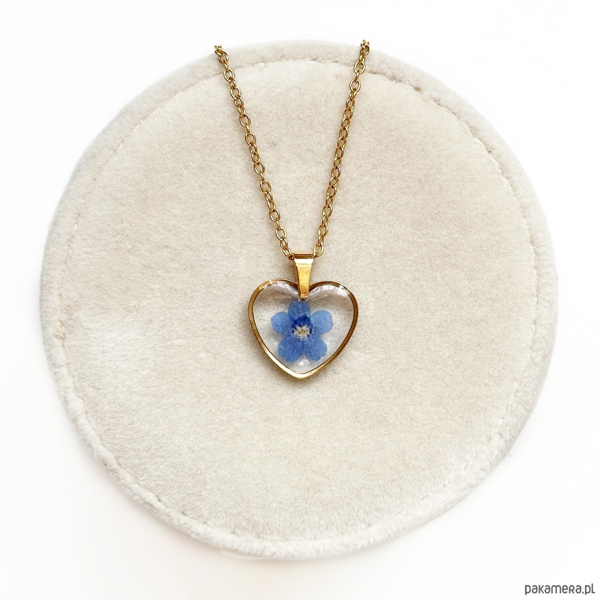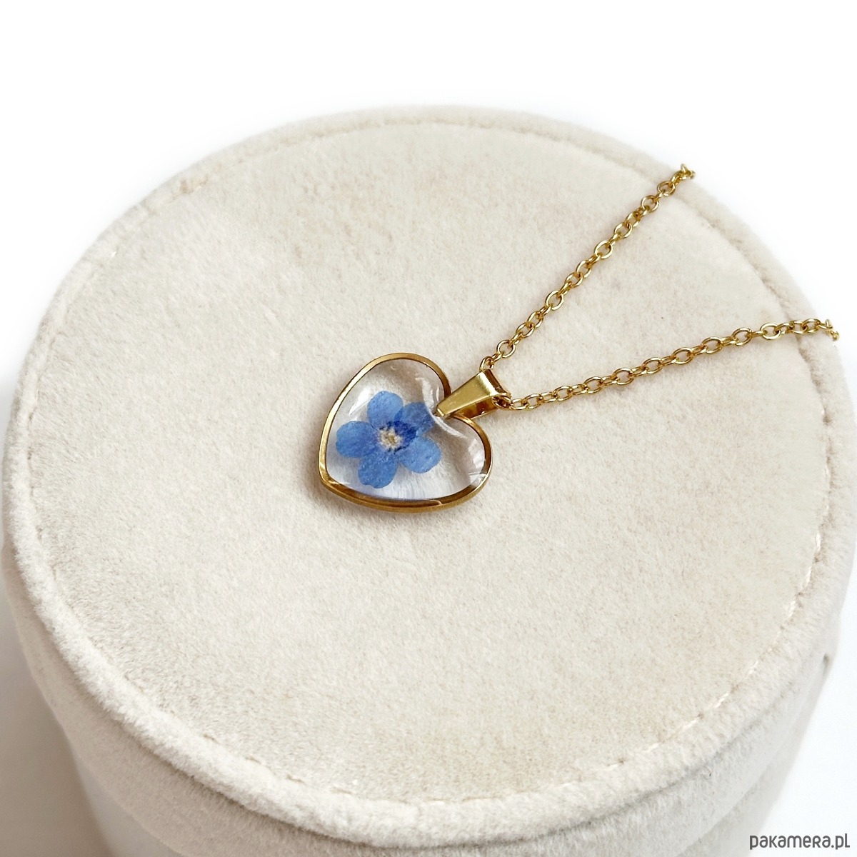 W naszyjniku zostały utrwalone kwiaty niezapominajki.