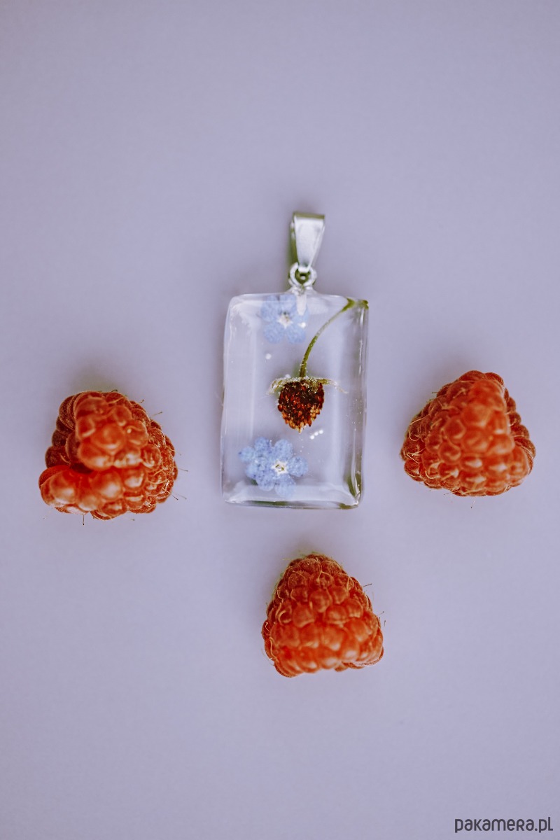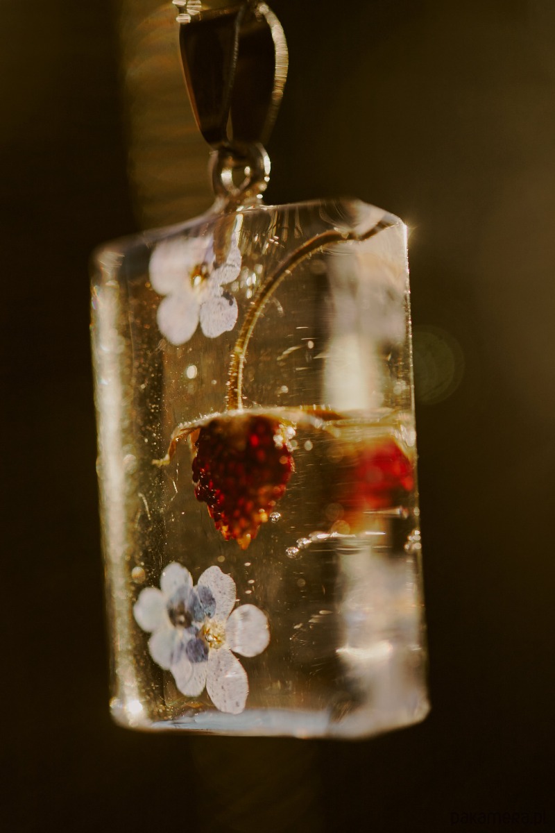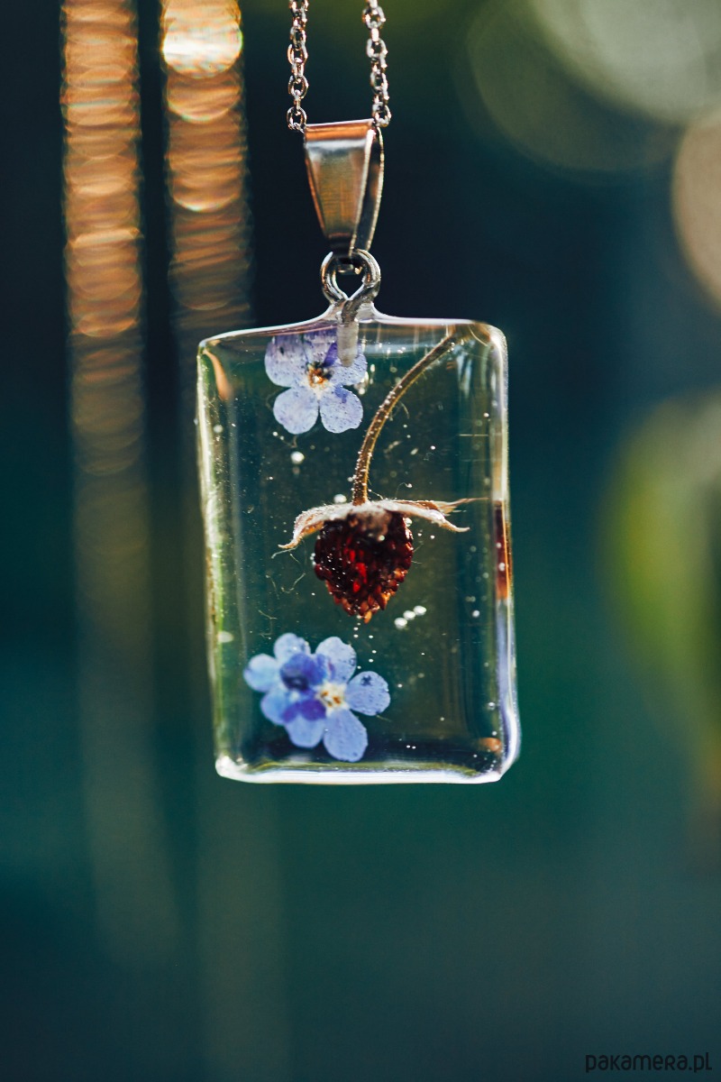 Ten naszyjnik to zamknięty w żywicy miniaturowy świat, prawdziwy ogród w wersji biżuteryjnej.
