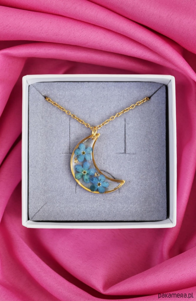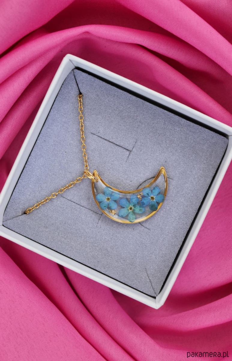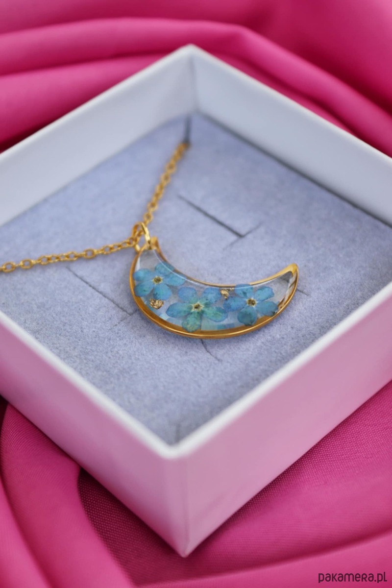 Naszyjnik z kwiatami suszonej niezapominajki to unikatowa, ręcznie wykonana biżuteria z serii Wdzięczność.