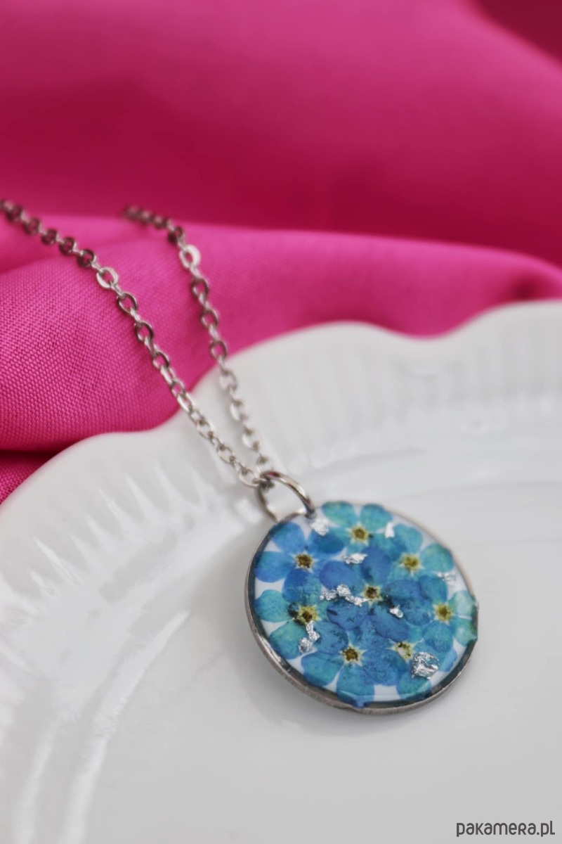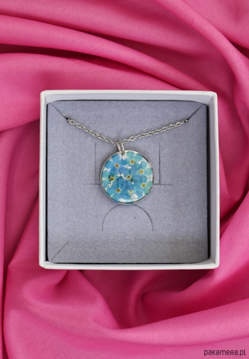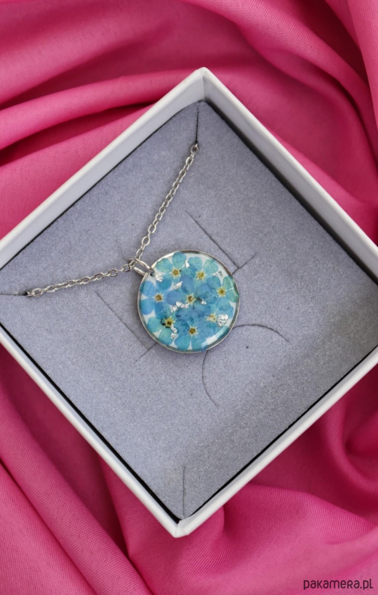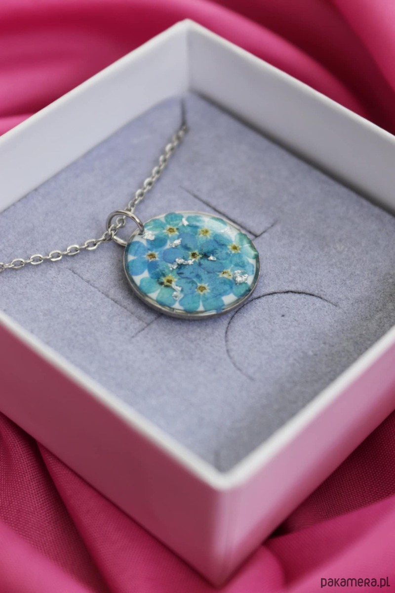 Naszyjnik z kwiatami suszonej niezapominajki to unikatowa, ręcznie wykonana biżuteria z serii Wdzięczność.