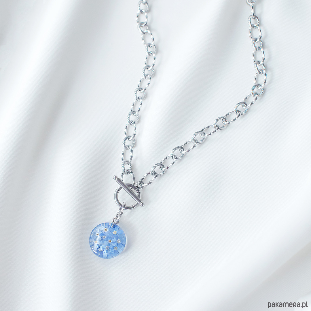 Naszyjnik wykonany jest z żywicy epoksydowej z wykorzystaniem suszonych kwiatów. Metalowe elementy to stal nierdzewna szlachetna chirurgiczna.