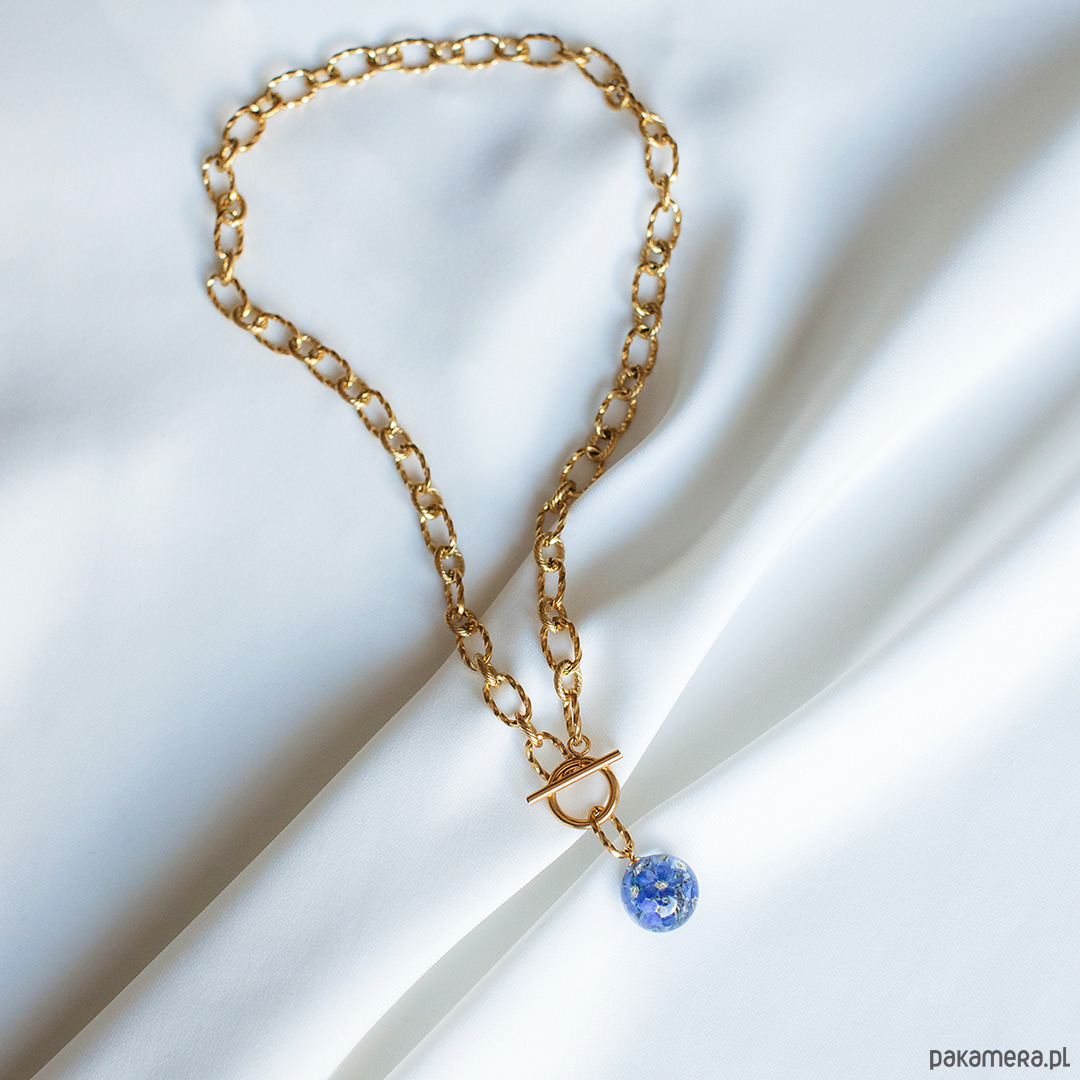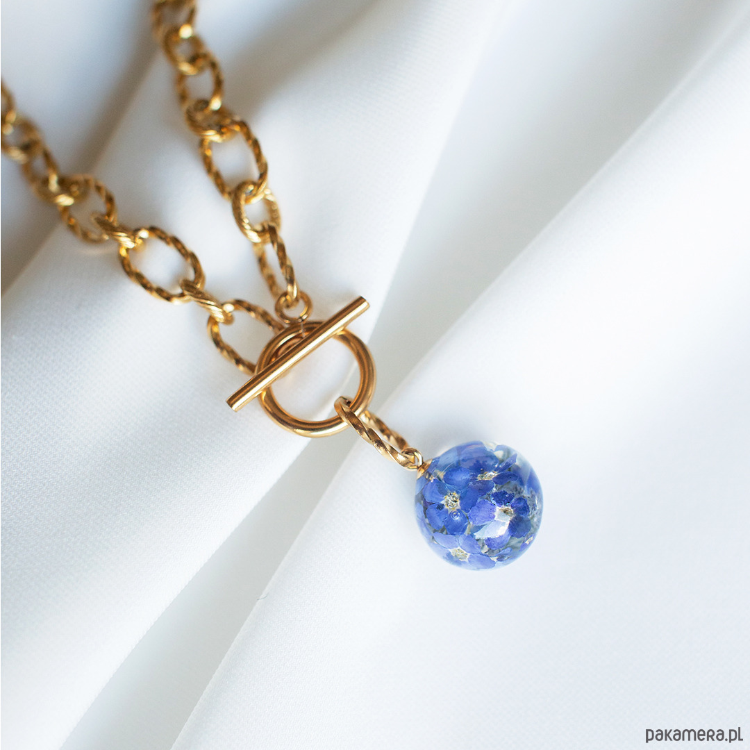 Naszyjnik wykonany jest z żywicy epoksydowej z wykorzystaniem suszonych kwiatów. Metalowe elementy to stal nierdzewna szlachetna chirurgiczna.