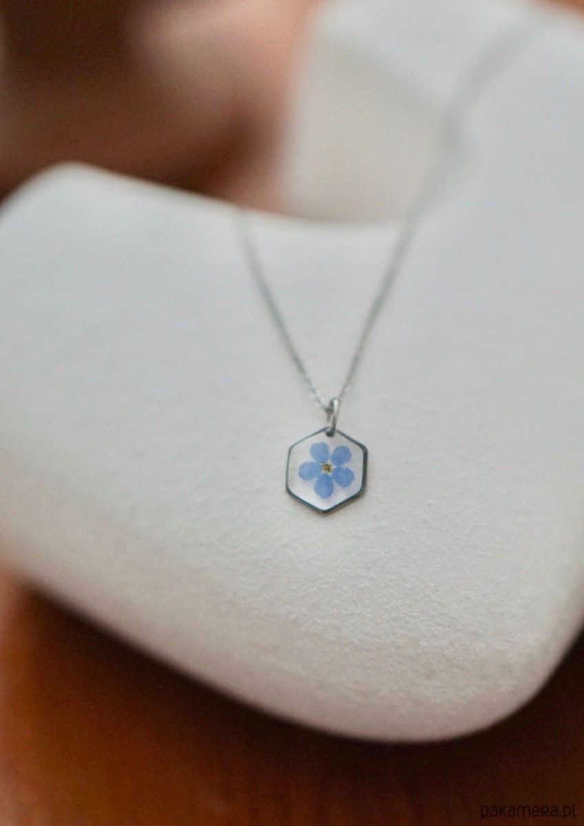 Naszyjnik wykonany ręcznie z suszonych kwiatów oraz żywicy epoksydowej. Wielkość zawieszki 10 mm. Długość łańcuszka 50 cm. Ramka oraz łańcuszek wykonane ze stali chirurgicznej w kolorze srebrnym. Naszyjnik pakowany jest w eleganckie pudełeczko prezentowe. Żywica epoksydowa nazywana „szkłem jubilerskim” jest coraz częściej stosowanym materiałem w tworzeniu biżuterii. Po zastygnięciu cechuje się wysokim połyskiem oraz przepięknie wydobywa kształt wraz z kolorem zatopionych elementów.