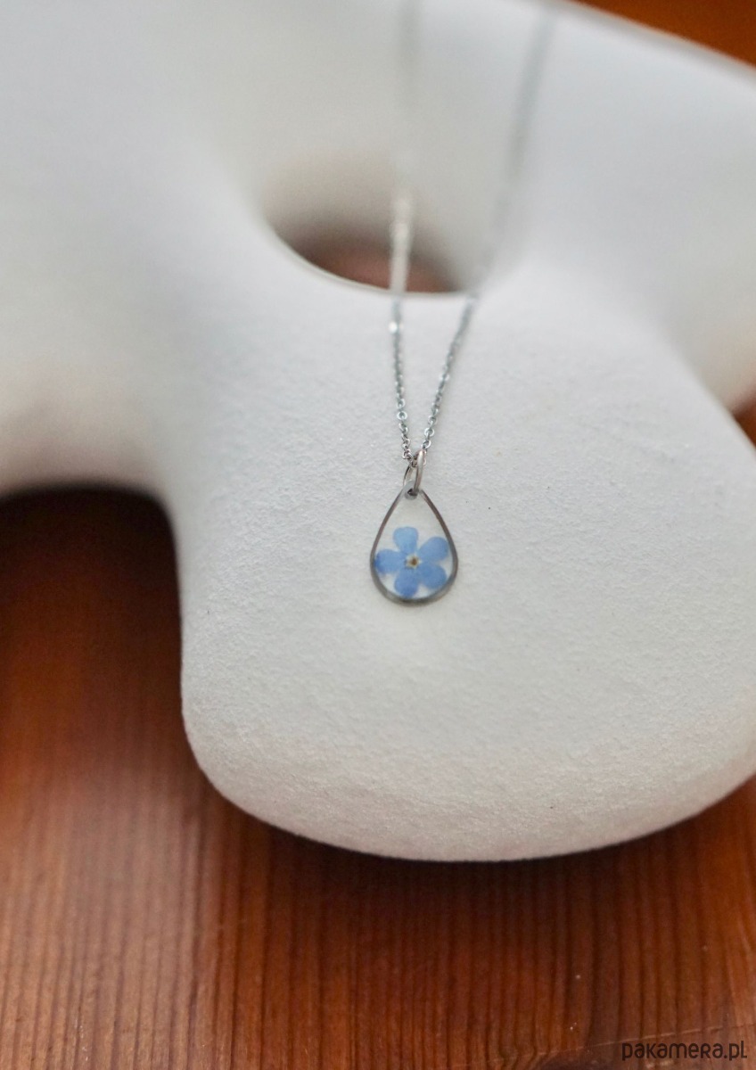 Naszyjnik wykonany ręcznie z suszonych kwiatów oraz żywicy epoksydowej. Wielkość zawieszki 15 mm. Długość łańcuszka 50 cm. Ramka oraz łańcuszek wykonane ze stali chirurgicznej w kolorze srebrnym. Naszyjnik pakowany jest w eleganckie pudełeczko prezentowe. Żywica epoksydowa nazywana „szkłem jubilerskim” jest coraz częściej stosowanym materiałem w tworzeniu biżuterii. Po zastygnięciu cechuje się wysokim połyskiem oraz przepięknie wydobywa kształt wraz z kolorem zatopionych elementów.