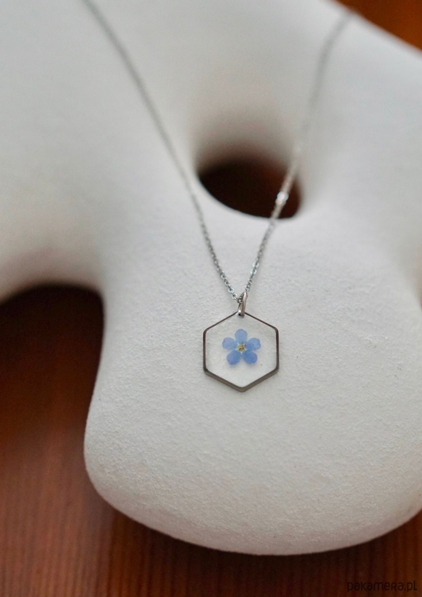 Naszyjnik wykonany ręcznie z suszonych kwiatów oraz żywicy epoksydowej. Wielkość zawieszki 15 mm. Długość łańcuszka 50 cm. Ramka oraz łańcuszek wykonane ze stali chirurgicznej w kolorze srebrnym. Naszyjnik pakowany jest w eleganckie pudełeczko prezentowe. Żywica epoksydowa nazywana „szkłem jubilerskim” jest coraz częściej stosowanym materiałem w tworzeniu biżuterii. Po zastygnięciu cechuje się wysokim połyskiem oraz przepięknie wydobywa kształt wraz z kolorem zatopionych elementów.