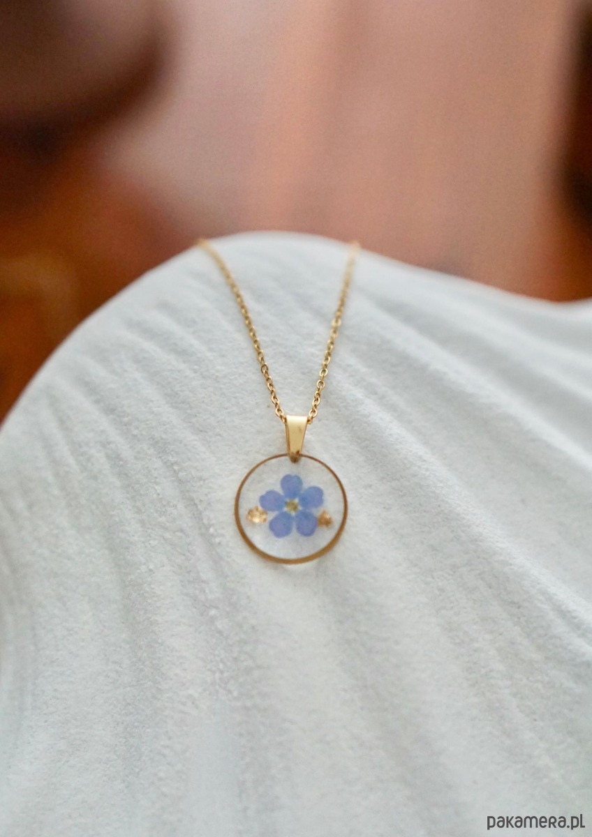 Naszyjnik wykonany ręcznie z suszonych kwiatów oraz żywicy epoksydowej. Wielkość zawieszki 15 mm. Długość łańcuszka 50 cm. Ramka oraz łańcuszek wykonane ze stali chirurgicznej w kolorze złotym. Naszyjnik pakowany jest w eleganckie pudełeczko prezentowe. Żywica epoksydowa nazywana „szkłem jubilerskim” jest coraz częściej stosowanym materiałem w tworzeniu biżuterii. Po zastygnięciu cechuje się wysokim połyskiem oraz przepięknie wydobywa kształt wraz z kolorem zatopionych elementów.