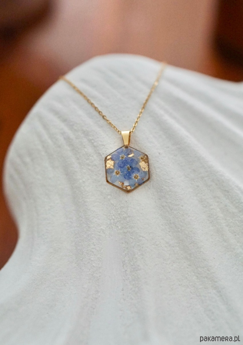 Naszyjnik wykonany ręcznie z suszonych kwiatów oraz żywicy epoksydowej. Wielkość zawieszki 15 mm. Długość łańcuszka 50 cm. Ramka oraz łańcuszek wykonane ze stali chirurgicznej w kolorze złotym. Naszyjnik pakowany jest w eleganckie pudełeczko prezentowe. Żywica epoksydowa nazywana „szkłem jubilerskim” jest coraz częściej stosowanym materiałem w tworzeniu biżuterii. Po zastygnięciu cechuje się wysokim połyskiem oraz przepięknie wydobywa kształt wraz z kolorem zatopionych elementów.