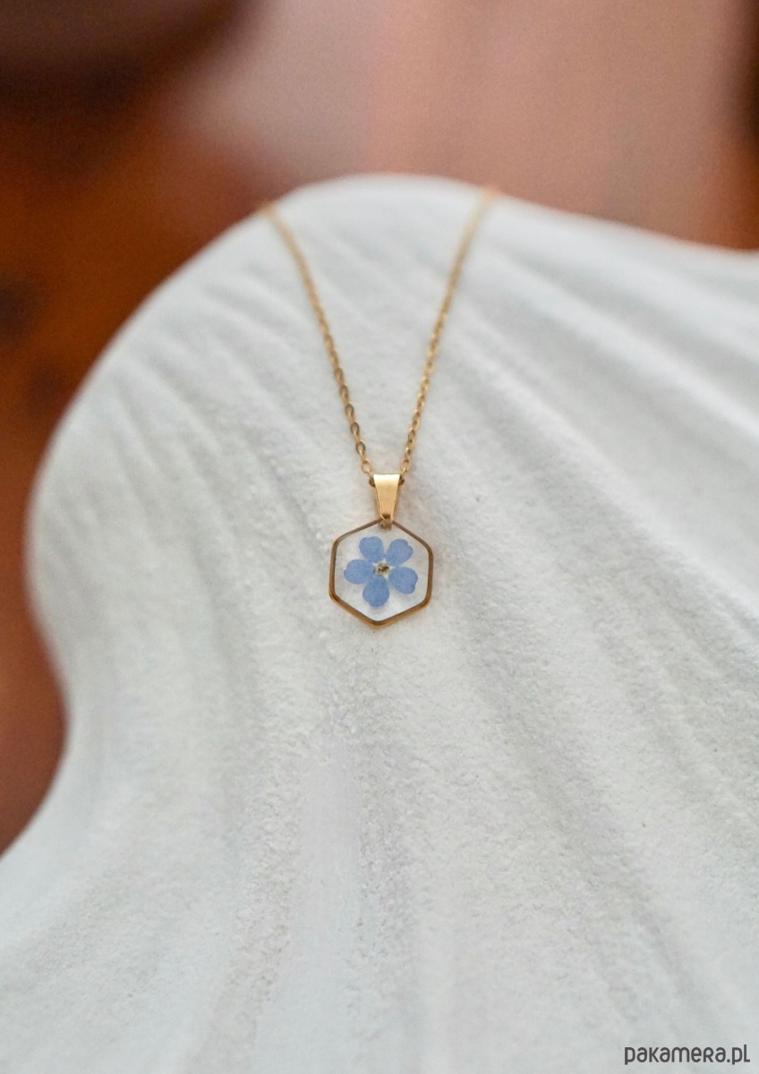Naszyjnik wykonany ręcznie z suszonych kwiatów oraz żywicy epoksydowej. Wielkość zawieszki 10 mm. Długość łańcuszka 50 cm. Ramka oraz łańcuszek wykonane ze stali chirurgicznej w kolorze złotym. Naszyjnik pakowany jest w eleganckie pudełeczko prezentowe. Żywica epoksydowa nazywana „szkłem jubilerskim” jest coraz częściej stosowanym materiałem w tworzeniu biżuterii. Po zastygnięciu cechuje się wysokim połyskiem oraz przepięknie wydobywa kształt wraz z kolorem zatopionych elementów.