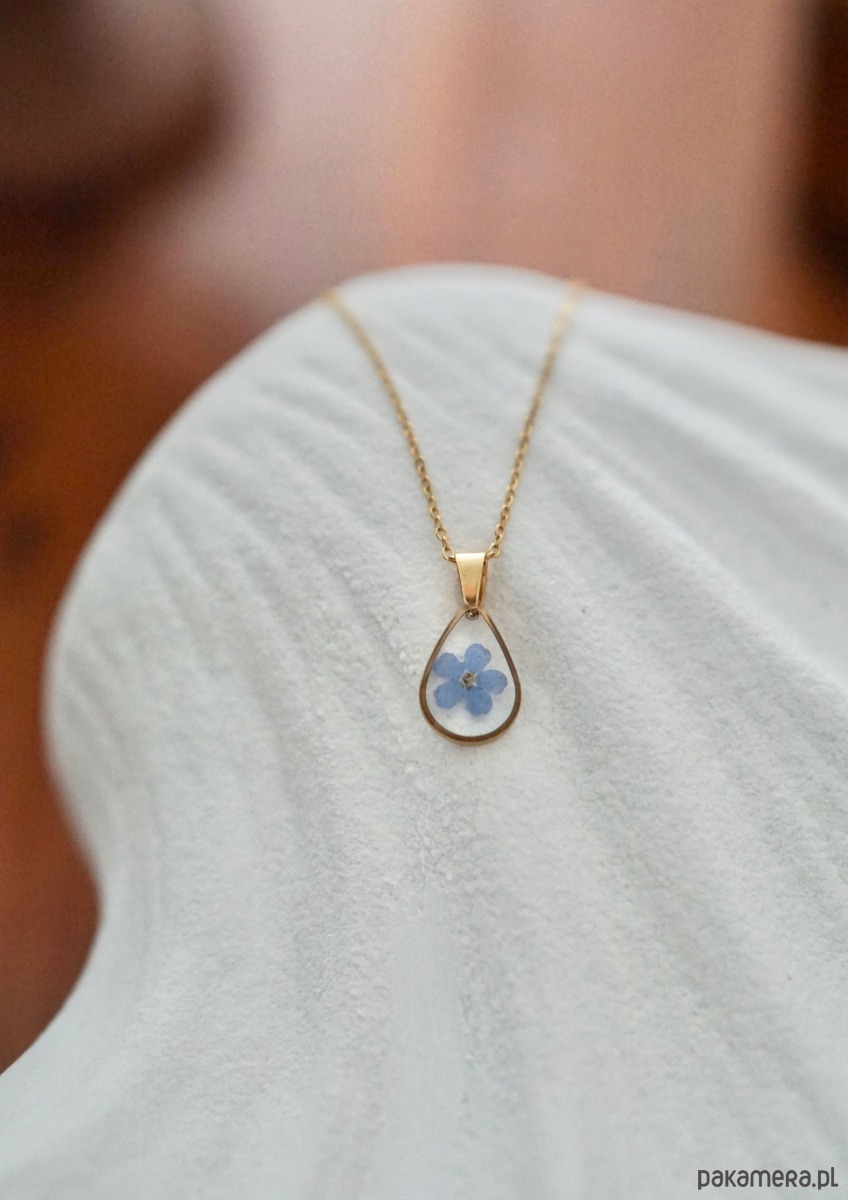 Naszyjnik wykonany ręcznie z suszonych kwiatów oraz żywicy epoksydowej. Wielkość zawieszki 12 mm. Długość łańcuszka 50 cm. Ramka oraz łańcuszek wykonane ze stali chirurgicznej w kolorze złotym. Naszyjnik pakowany jest w eleganckie pudełeczko prezentowe. Żywica epoksydowa nazywana „szkłem jubilerskim” jest coraz częściej stosowanym materiałem w tworzeniu biżuterii. Po zastygnięciu cechuje się wysokim połyskiem oraz przepięknie wydobywa kształt wraz z kolorem zatopionych elementów.