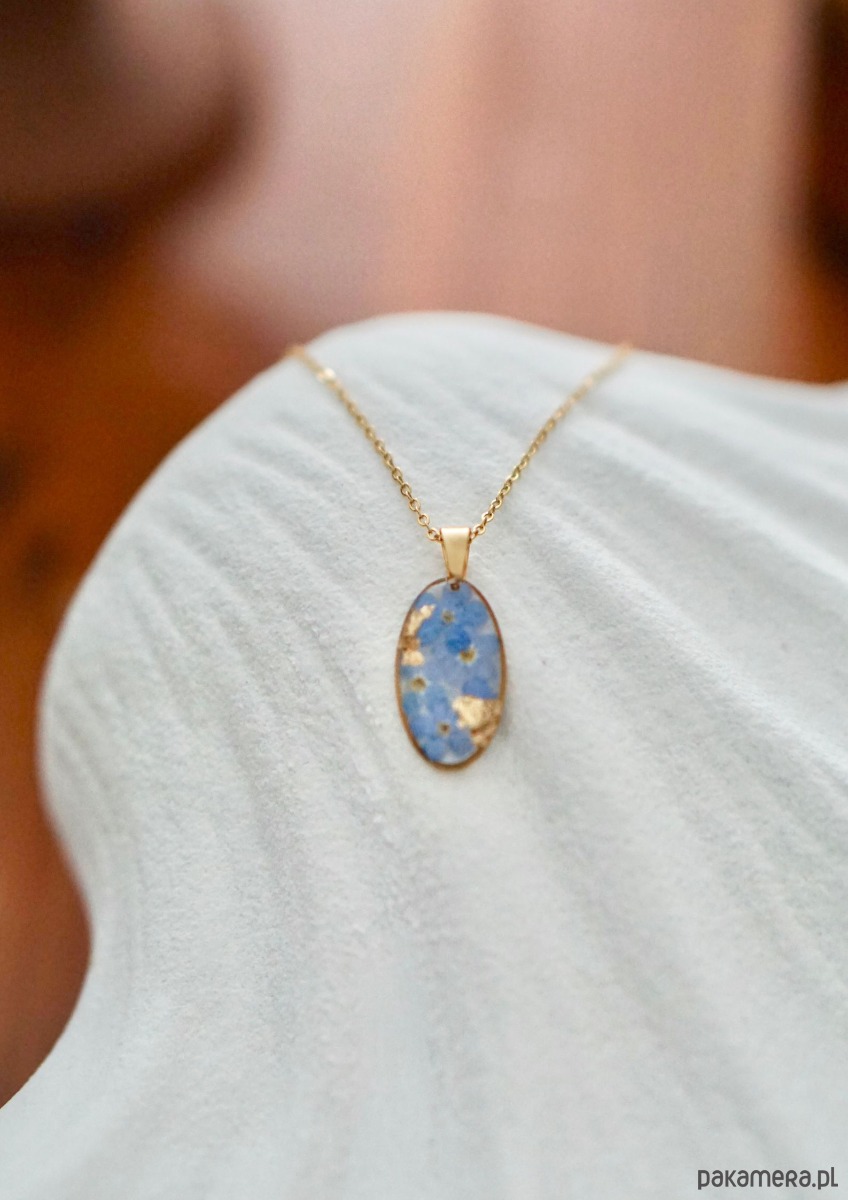 Naszyjnik wykonany ręcznie z suszonych kwiatów oraz żywicy epoksydowej. Wielkość zawieszki 20 mm. Długość łańcuszka 50 cm. Ramka oraz łańcuszek wykonane ze stali chirurgicznej w kolorze złotym. Naszyjnik pakowany jest w eleganckie pudełeczko prezentowe. Żywica epoksydowa nazywana „szkłem jubilerskim” jest coraz częściej stosowanym materiałem w tworzeniu biżuterii. Po zastygnięciu cechuje się wysokim połyskiem oraz przepięknie wydobywa kształt wraz z kolorem zatopionych elementów.