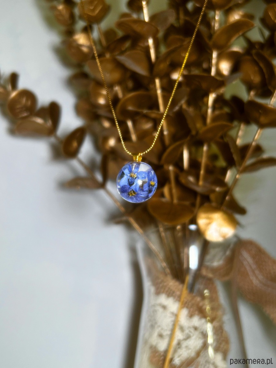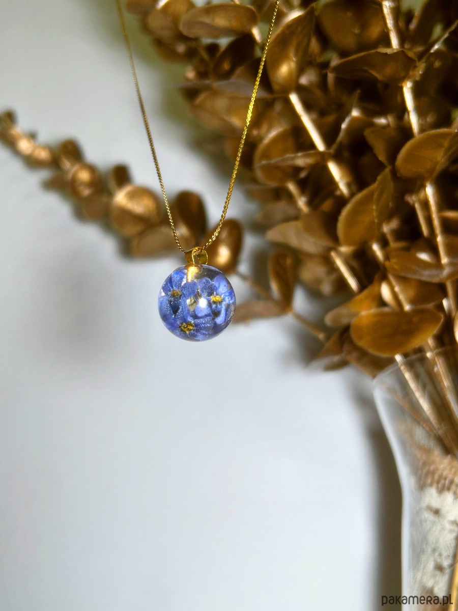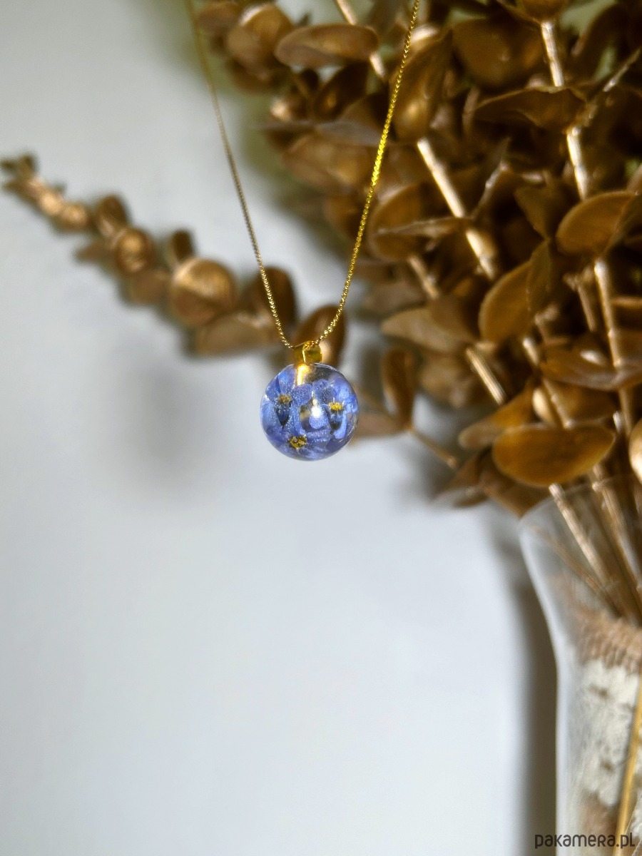 Naszyjnik z niezapominajkami zamkniętymi w kulce z żywicy