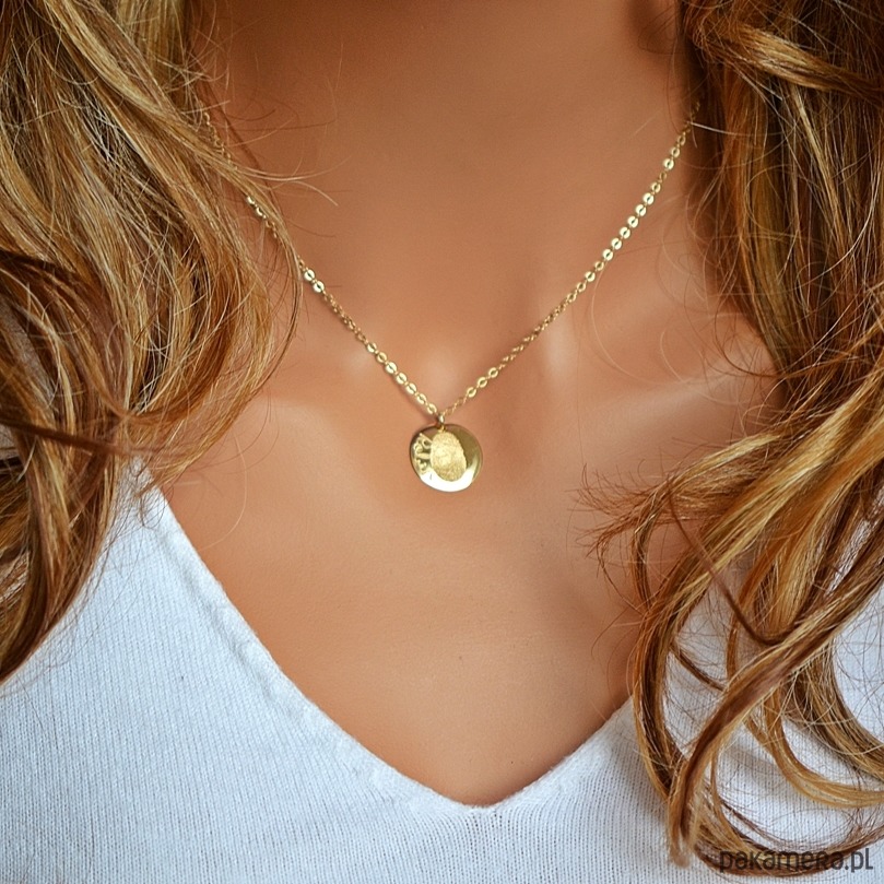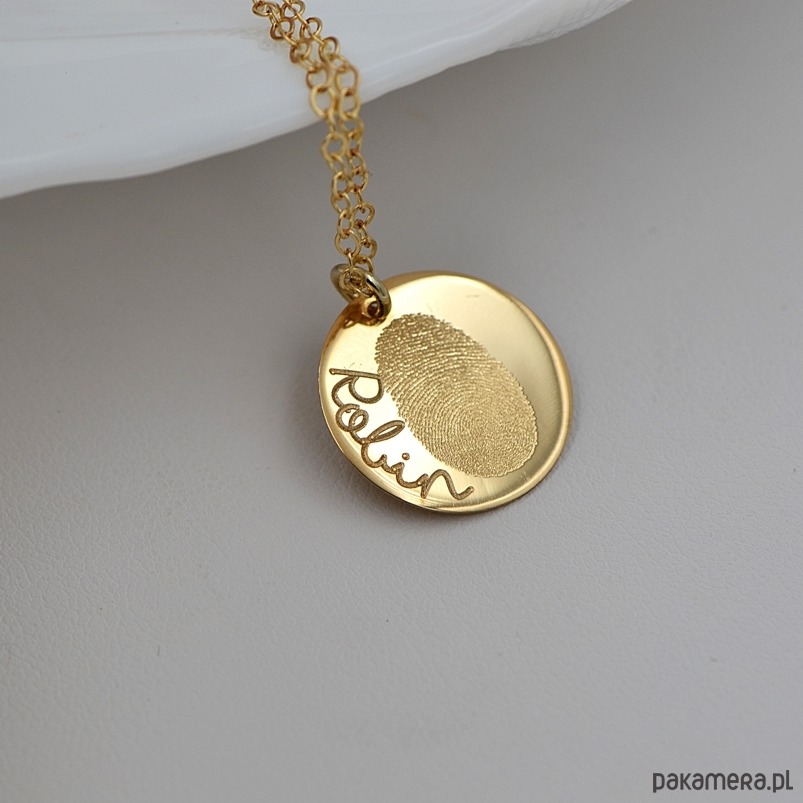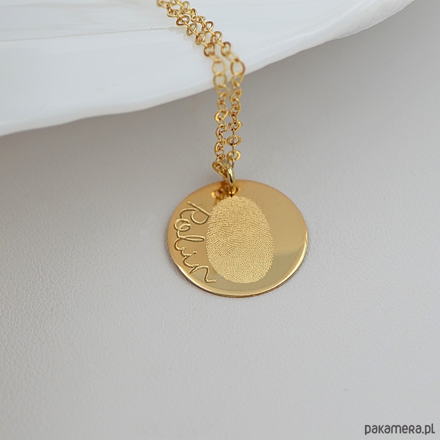 Naszyjnik złocony z medalionem z odciskiem palca i mieniem. Medalion jest mocno wypolerowany i błyszczący.