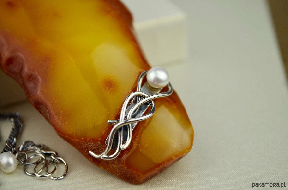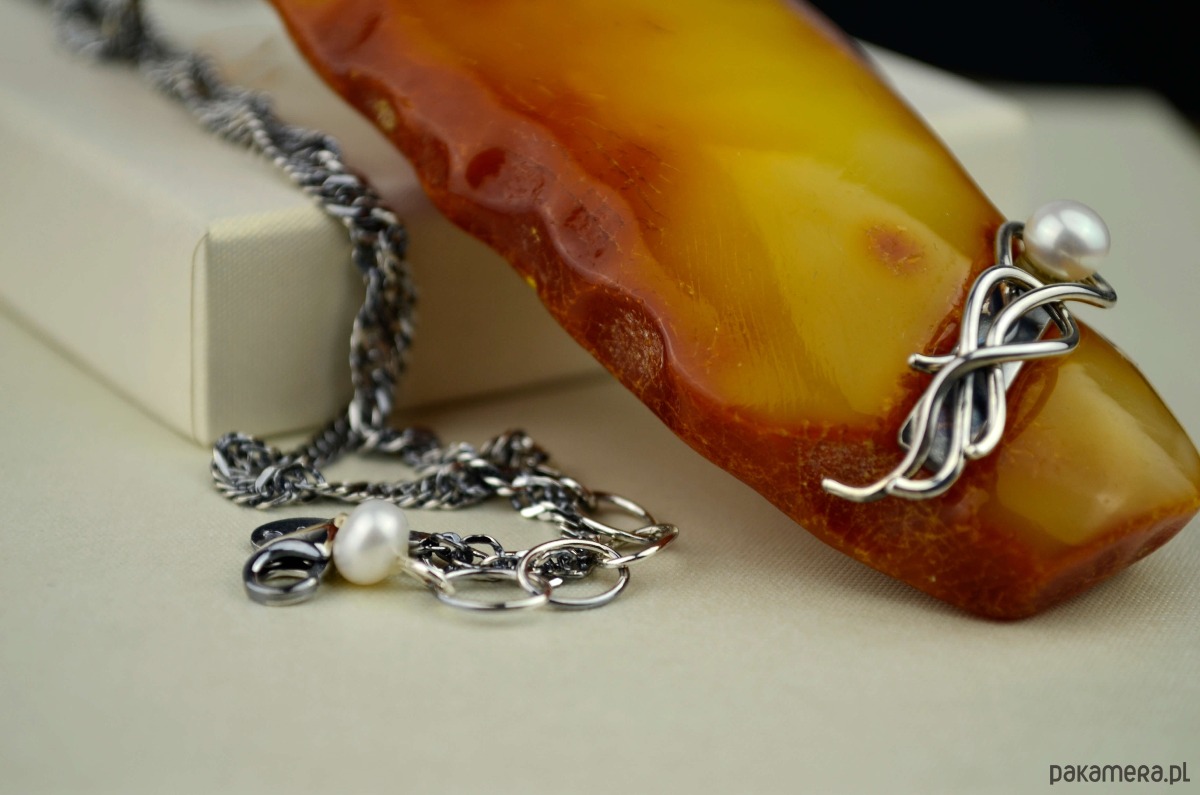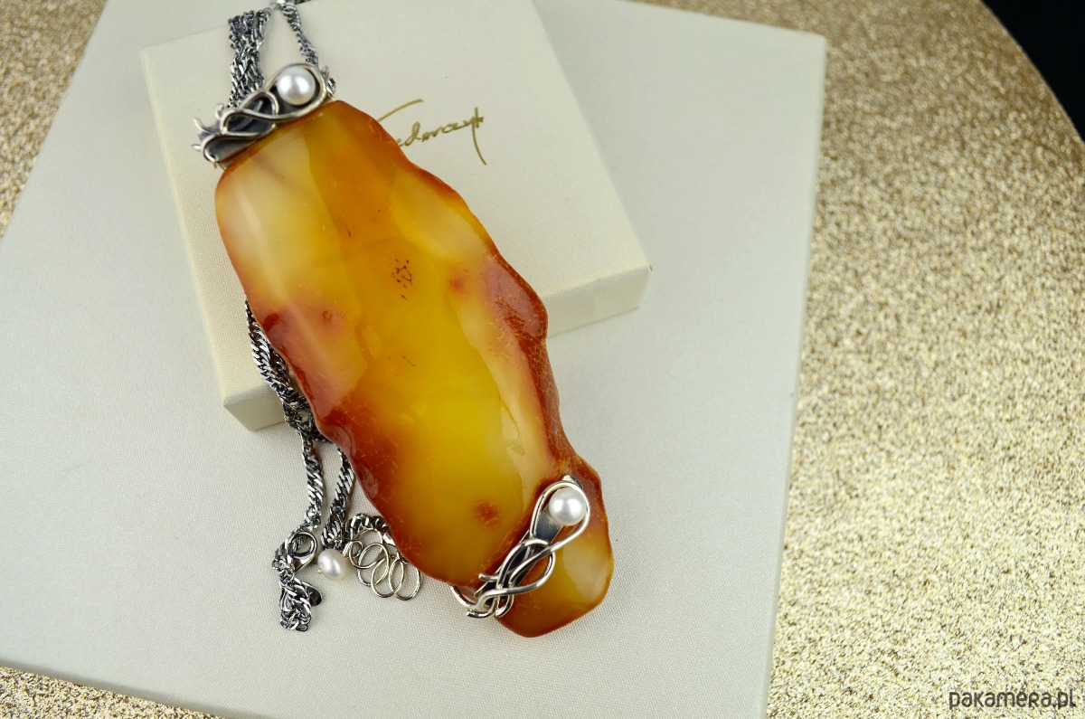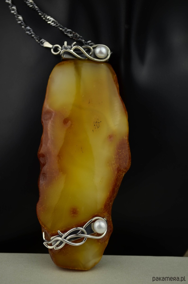 Duży podłużny bursztyn ozdobiłam srebrem i białymi perełkami. Z wierzchu bursztyn jest wypolerowany i ma jasny żółty odcień, od spodu pozostawiona jest naturalna bursztynowa kora w ciemnym kolorze. Perły osadziłam w ozdobnych srebrnych zawijasach przypominających kształtem morskie fale. Pokaźny bursztynowy wisior zawieszony jest na eleganckim łańcuszku o skręconym splocie. Srebro w naszyjniku jest przyciemnione i wypolerowane, co podkreśla ozdobną formę metalu.