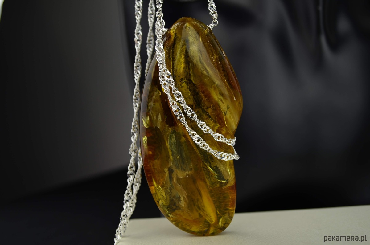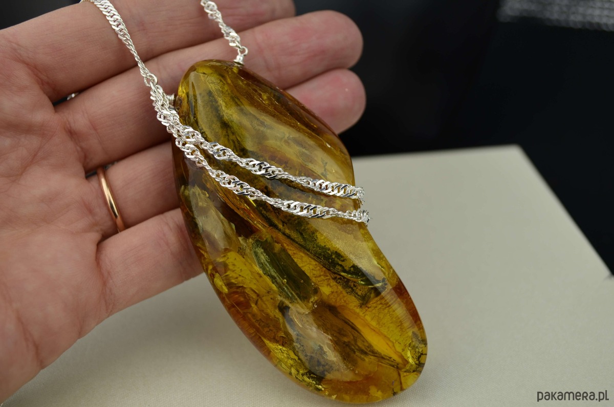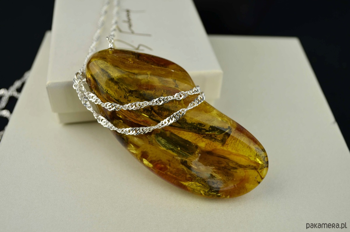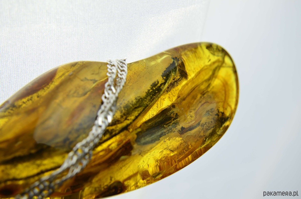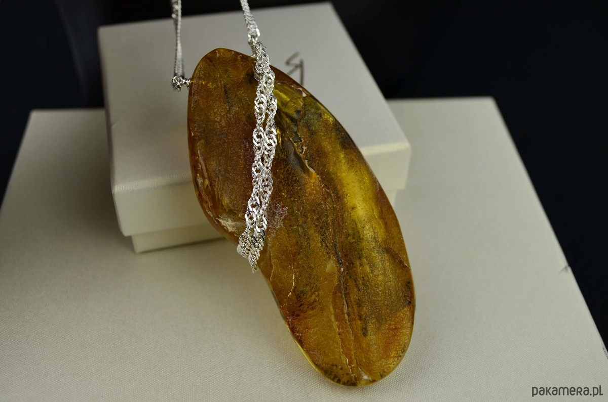 Ogromny kawałek bursztynu przypomina z wyglądu skrzydło owada- przeświecająca żółta żywica ze szczątkami prastarego lasu. Od spodu widać charakterystyczną dla naturalnego bursztynu korę. Bursztyn połączyłam z szerokim srebrnym łańcuszkiem, tak powstał prosty, ale bardzo widoczny naszyjnik kuszący pięknem bursztynu i blaskiem srebra.