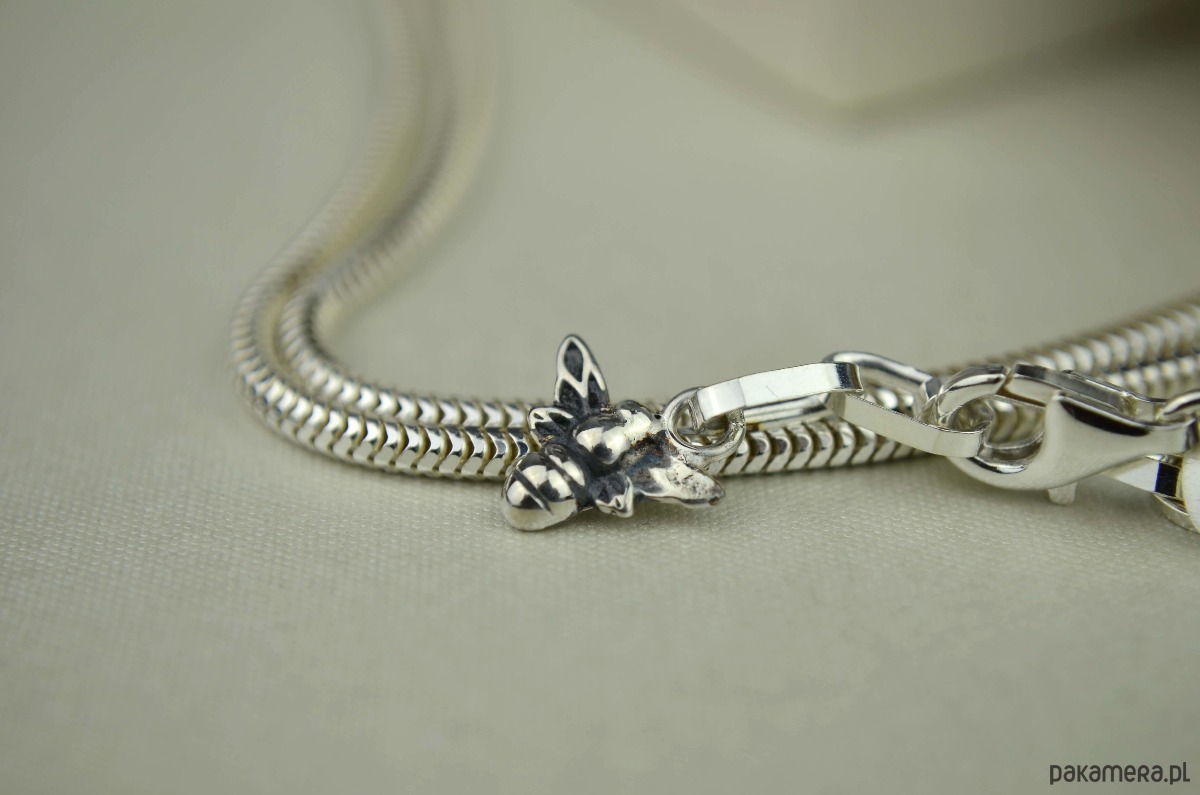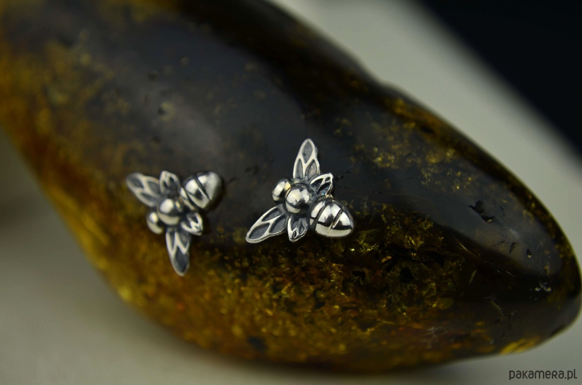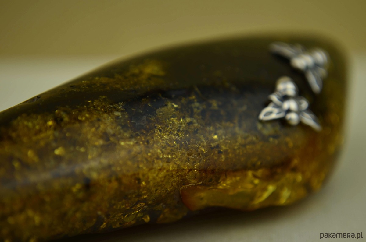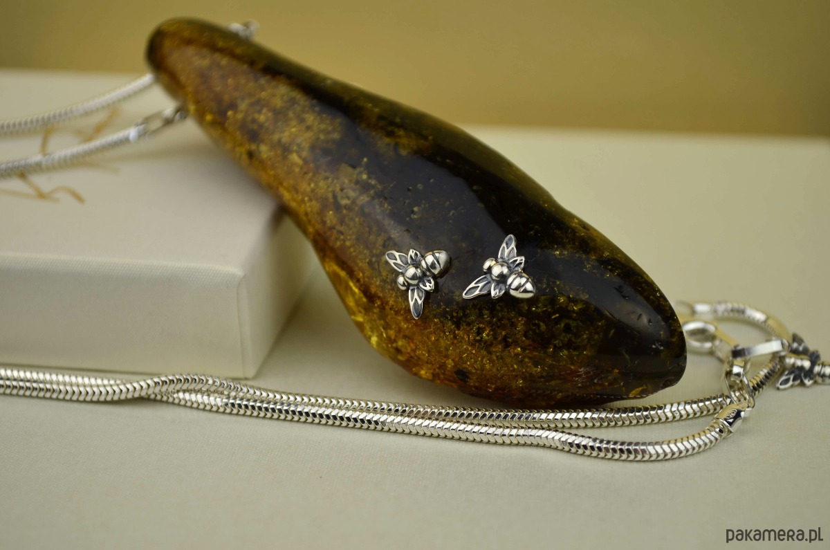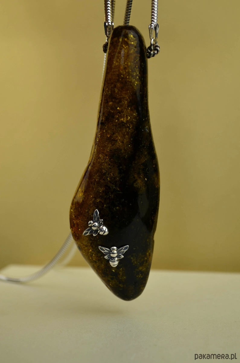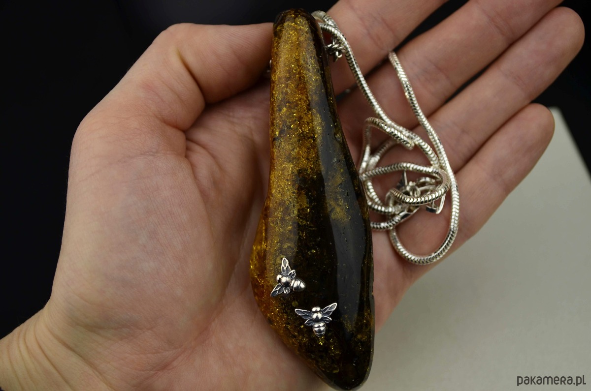 Oryginalna podłużna bryłka naturalnego bursztynu jest tak duża, że ledwo mieści się w dłoni (waży ponad 32 gramy!). Zawiesiłam ją na bardzo eleganckim łańcuszku- grubej lince ze srebra. Na wielobarwnym bursztynie przysiadły dwie srebrne pszczółki, trzecia ozdobiła koniec przedłużki. Ten długi naszyjnik przypadnie do gustu miłośniczkom niebanalnej i widocznej bursztynowej biżuterii ze srebra.