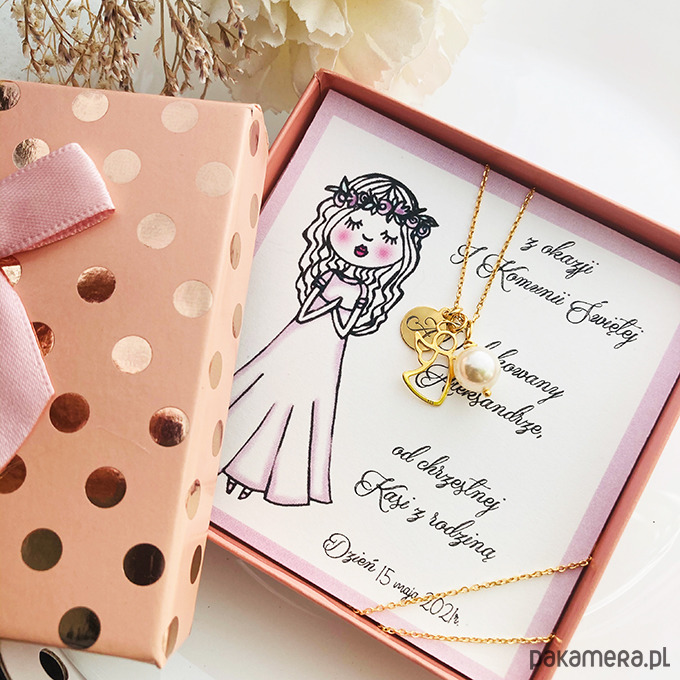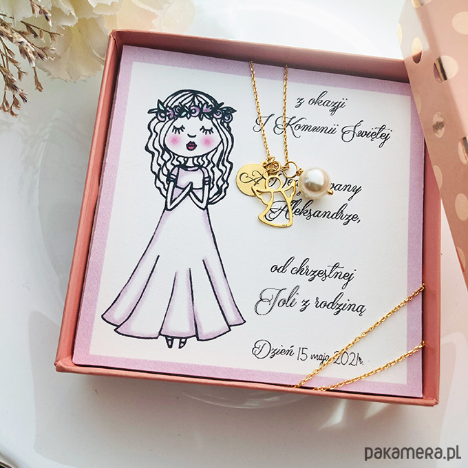 Wyjątkowy unikalny prezent dla dziewczynki z okazji Pierwszej Komunii , zawiera ponadczasowy naszyjnik z perłą Swarovski z wybranym inicjałem i aniołkiem ze srebra złoconego 24 k złotem ( opcjonalnie z wykonaną ręcznie kartą z życzeniami).