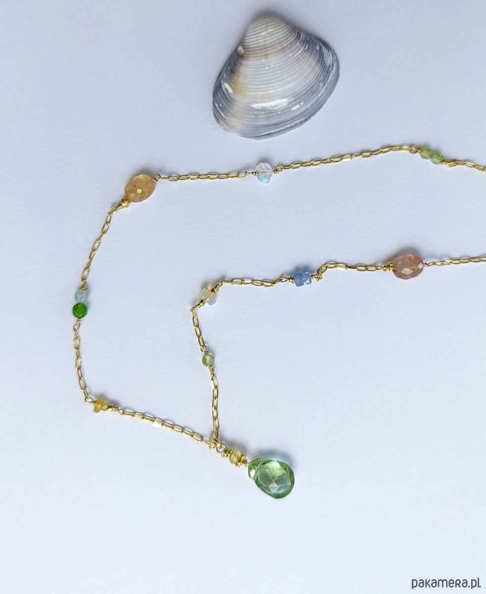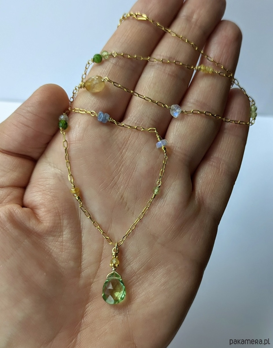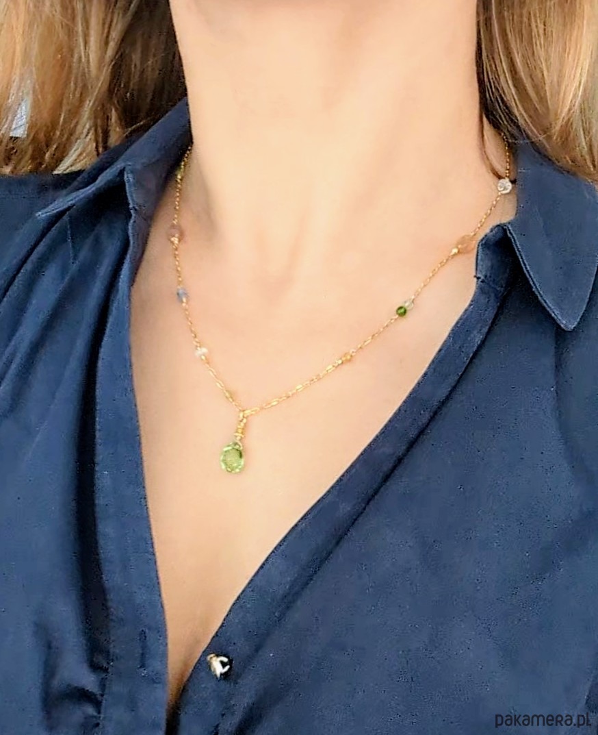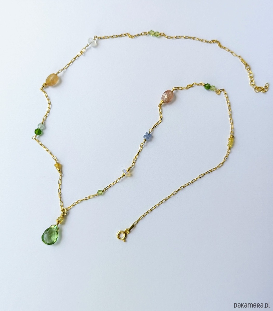 Naszyjnik z pięknymi, przejrzystymi i migoczącymi kamieniami. W roli głównej zawieszka z zielonym oliwinem oraz żółtymi szafirami. Pozostałe wplecione kamienie to szafiry, opal etiopski, diopsyd, oliwin, tanzanit, akwamaryn i kamień księżycowy. Autorski pomysł, ręczne wykonanie, wyjątkowy dobór kamieni. Bardzo polecam.