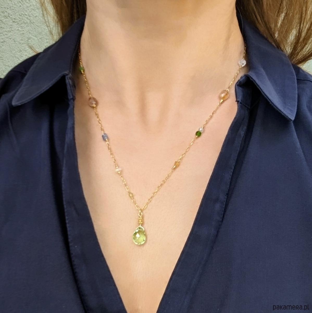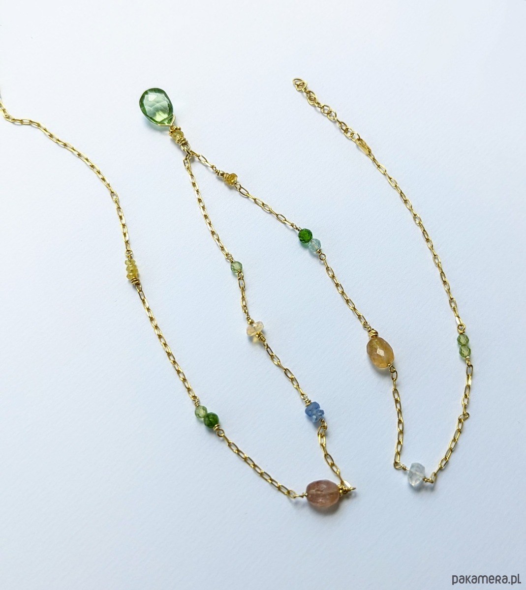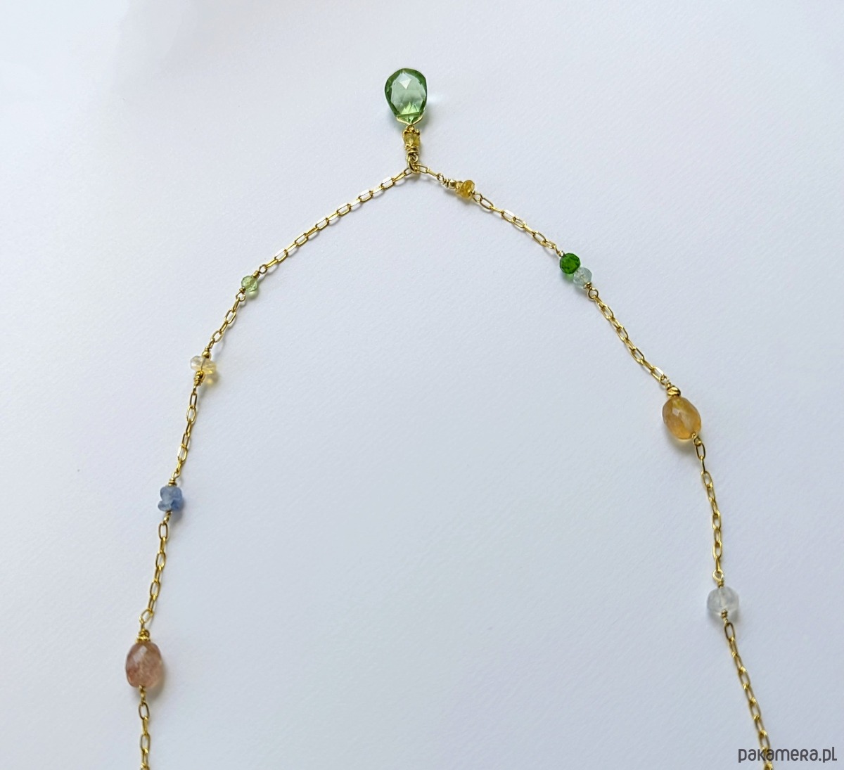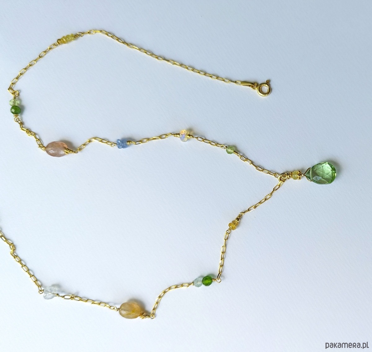 Naszyjnik z pięknymi, przejrzystymi i migoczącymi kamieniami. W roli głównej zawieszka z zielonym oliwinem oraz żółtymi szafirami. Pozostałe wplecione kamienie to szafiry, opal etiopski, diopsyd, oliwin, tanzanit, akwamaryn i kamień księżycowy. Autorski pomysł, ręczne wykonanie, wyjątkowy dobór kamieni. Bardzo polecam.