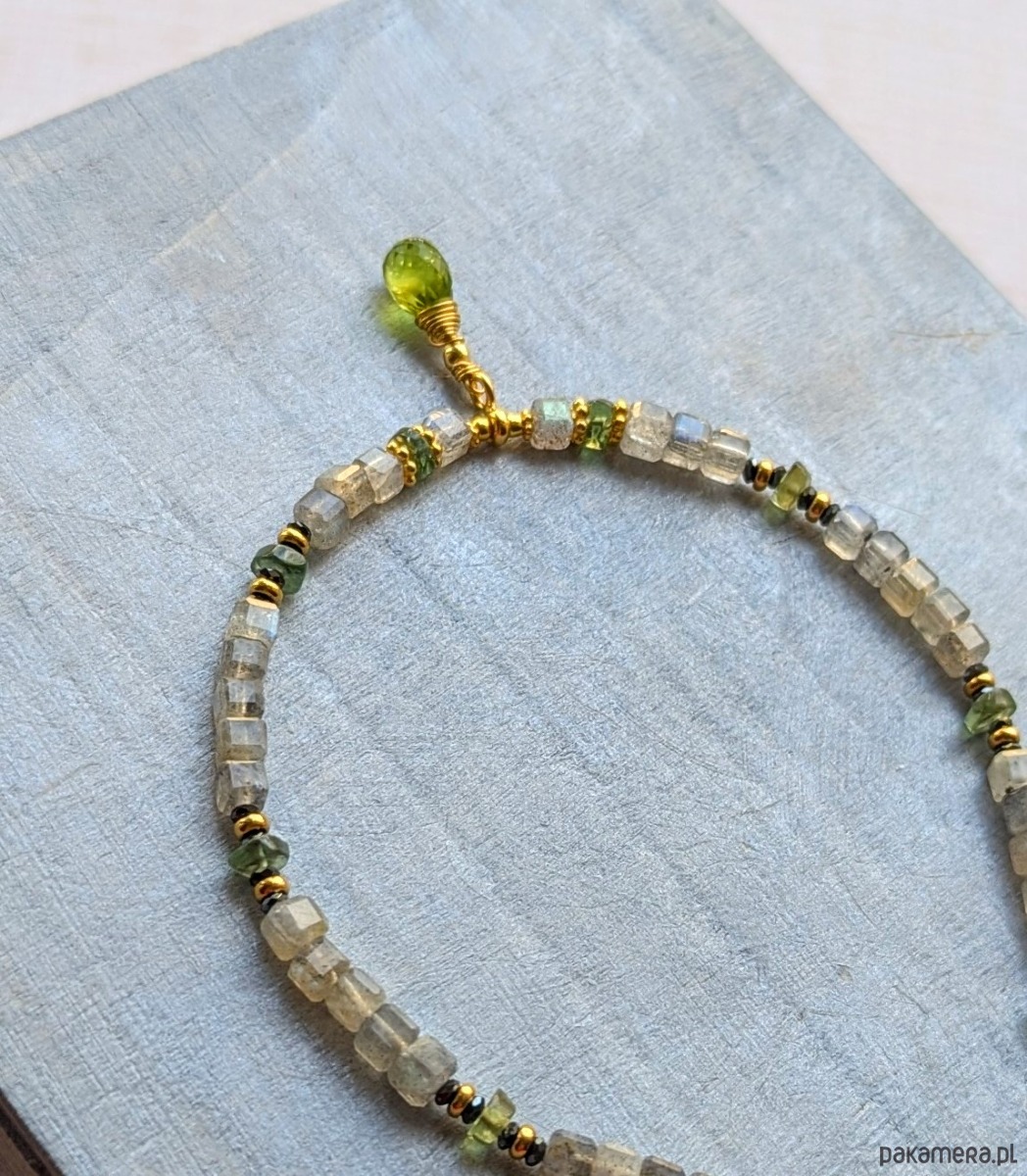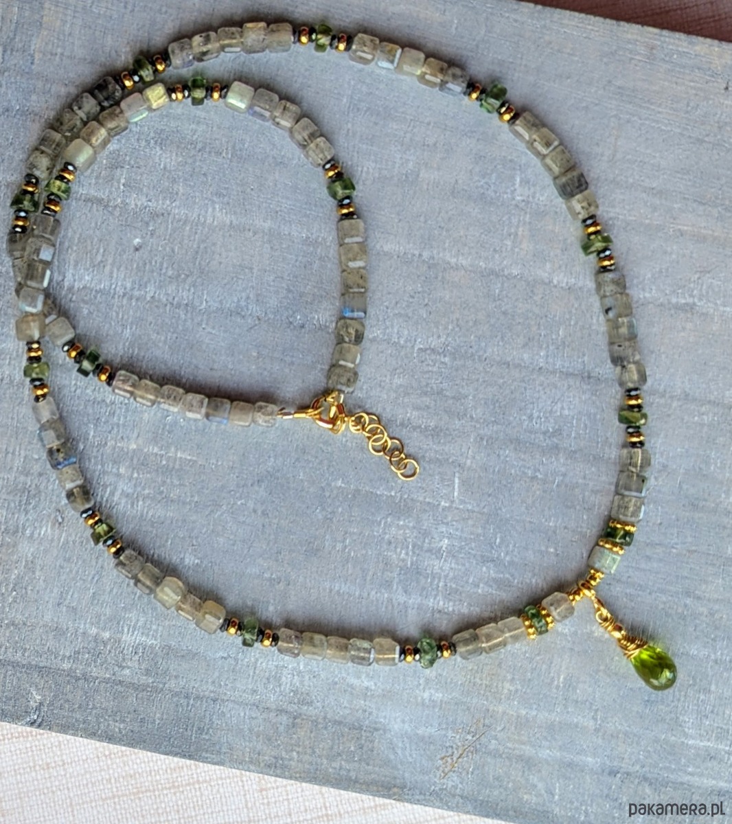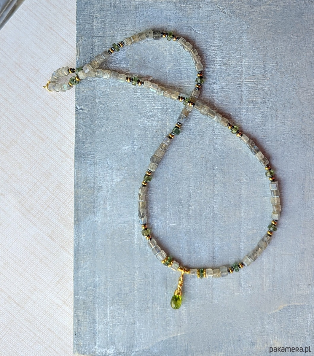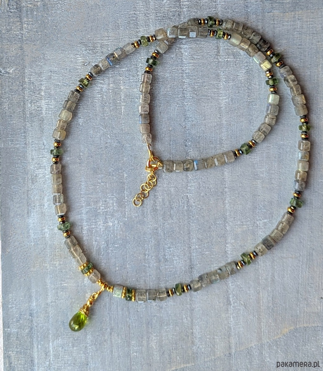 Subtelny i spokojny naszyjnik z kosteczek labradorytu, z akcentami zielonych oliwinów, złoconego hematytu oraz pozłacanego srebra. Lekko mleczny, miejscami opalizujący labradoryt kontrastuje ze świetlistą kroplą oliwinu w zawieszce. Całość jest delikatna, jak pierwsze sygnały zbliżającej się wiosny.