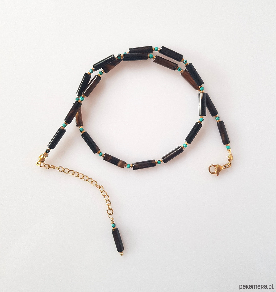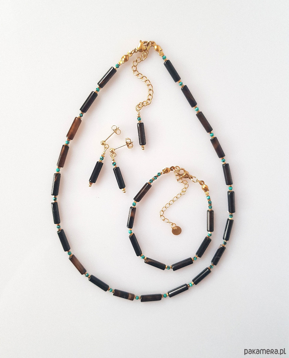 Patyczki onyksu pasiastego i drobne fasetowanego kuleczki turkusowego magnezytu.