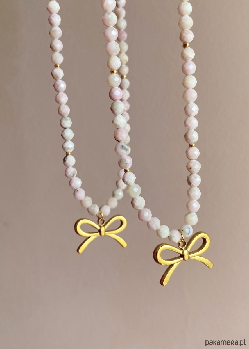 Naszyjnik z Opalem jest krótki, zrobiony na zasadzie chokera, w całości wykonany z Opali Różowych (4mm) oraz ze stali szlachetnej w kolorze złotym. Wielkość kokardki wynosi około 12mm. Długość naszyjnika to około 40cm.