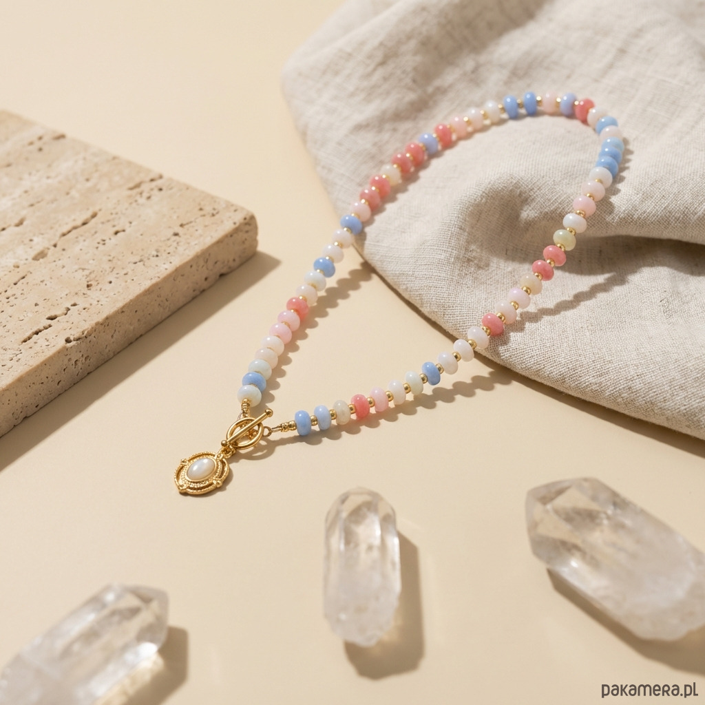 Wyjątkowy naszyjnik z jadeitów w pastelowych, cukierkowych odcieniach i złotych hematytów.