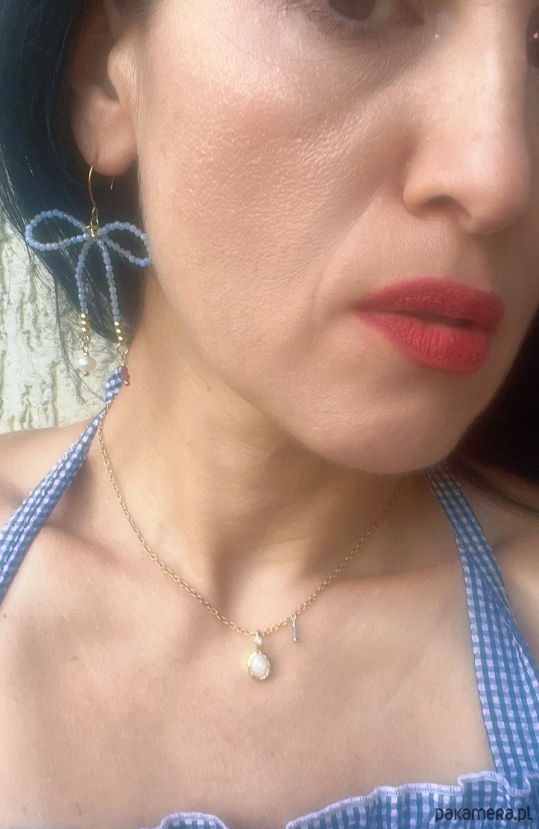 Centralnym elementem naszyjnika jest wisiorek ze stali szlachetnej ozdobiony syntetycznym opalem o opalizującym blasku oraz błyszczącą cyrkonią.